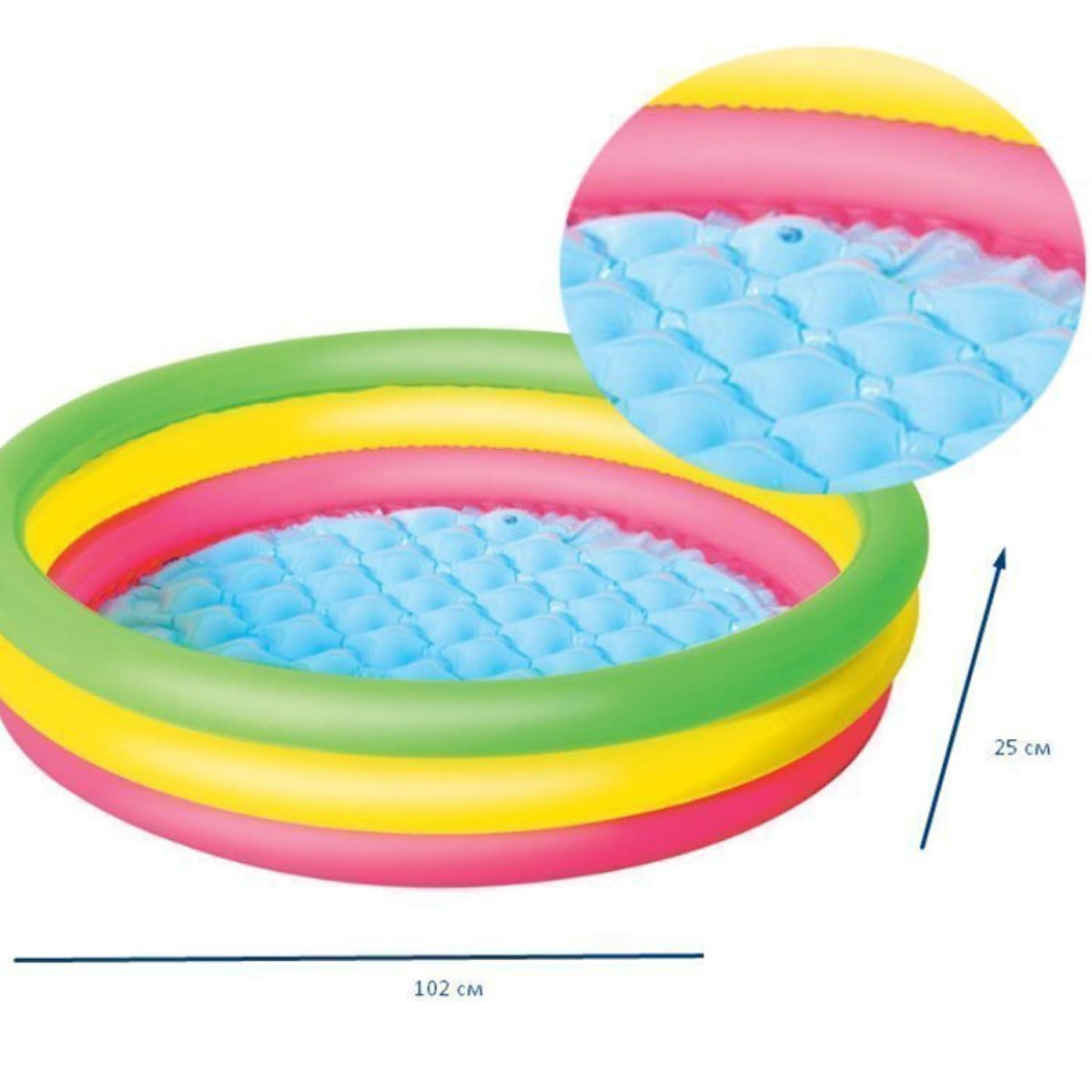 Надувной круглый бассейн Bestway для малышей от 2 лет. Изготовлен из высококачественного винила, прочный, устойчивый, надежный и безопасный. Имеет мягкие стенки с широким бортиком и жесткое дно из ПВХ-пленки.Быстро и легко надувается и размещается на любой ровной поверхности.Материал: высококачественный винилТолщина материала: 0.19 ммКоличество воздушных камер: 4Рекомендуемый возраст: от 2 летДно: надувное, 0.19 ммДиаметр: 102 смВысота бортов: 25 смОбъём бассейна: 62 лКомплектация:Клапан для накачивания: силиконовый;Клапан для слива воды: нет;Ремкомплект.