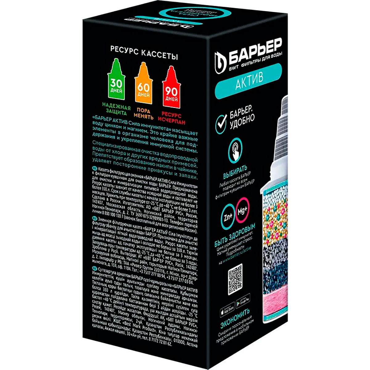Сменный картридж "Барьер-актив" позволит очистить воду от вредных примесей и обогатит её полезными веществами.Преимущества использования картриджа "Барьер":Обогащает воду цинком и магнием: цинк укрепляет иммунитет, магний помогает бороться со стрессом.Очищает водопроводную воду от хлора и других вредных примесей.Препятствует образованию накипи в чайнике.Удаляет посторонние привкусы и запахи.Позаботьтесь о своём здоровье и здоровье ваших близких!Общие характеристики:Тип: картриджТип фильтра: кувшинС активированным углем: даС магнием: естьМеханическая фильтрация: естьОчистка от свободного хлора: даМинерализация воды: естьКоличество степеней очистки: 1.Обогащает воду цинком и магнием.