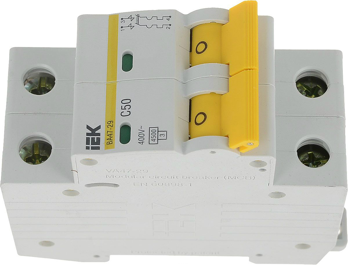 Автоматические выключатели ВА47-29 это механический коммутационный аппарат, способный включать, проводить и отключать токи при нормальном состоянии цепи, а также включать, проводить в течение заданного времени и автоматически отключать токи в указанном аномальном состоянии цепи, таких, как токи короткого замыкания. Автоматические выключатели предназначены для защиты распределительных и групповых цепей, имеющих различную нагрузку: - электроприборы, освещение - выключатели с характеристикой В, - двигатели с небольшими пусковыми токами (компрессор, вентилятор) - выключатели с характеристикой C; - двигатели с большими пусковыми токами (подъемные механизмы, насосы) - выключатели с характеристикой D. Автоматические выключатели ВА47-29 рекомендуются к применению в вводно- распределительных устройствах для жилых и общественных зданий. 200 типоисполнений на 18 номинальных токов от 0,5 до 63 А. Преимущества: Два типа защиты от перегрузки и короткого замыкания. Полный комплект дополнительных устройств с возможностью простой самостоятельной установки: - контакт состояния КС47; - контакт состояния КСВ47; - расцепитель минимального напряжения РММ47; - расцепитель независимый РН47. Усовершенствованная дугогасительная система: увеличенный срок службы, повышенная устойчивость к токам короткого замыкания. Возможность одновременного присоединения шиной FORK и гибким проводником для распределения питания цепи через верхние зажимы, а также возможность соединения шиной PIN. Наличие индикатора положения контактов. Широкий диапазон рабочих температур от -40 до +50 °С. Новый эргономичный дизайн рукоятки включения/выключения. Насечки на контактных зажимах снижают тепловые потери и увеличивают механическую устойчивость соединения.