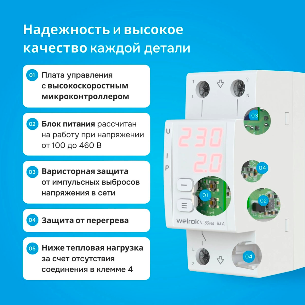 TrueRMS для точного измерения напряженияРеле напряжения с контролем тока Welrok VI red защищает оборудование от скачков и провалов напряжения, последствий обрыва нулевого провода и превышения тока или мощности. Реле отключает нагрузку, если напряжение, ток или мощность выходит за установленные пределы и автоматически включает нагрузку, когда значение параметра вернется в норму. Welrok VI red - компактное реле на 2 модуля с мощным функционалом:Позволяет выбрать, по какому из параметров - ток или мощность - будет срабатывать защита вместе с защитой по напряжению.Скорость срабатывания реле < 0,03 сек.