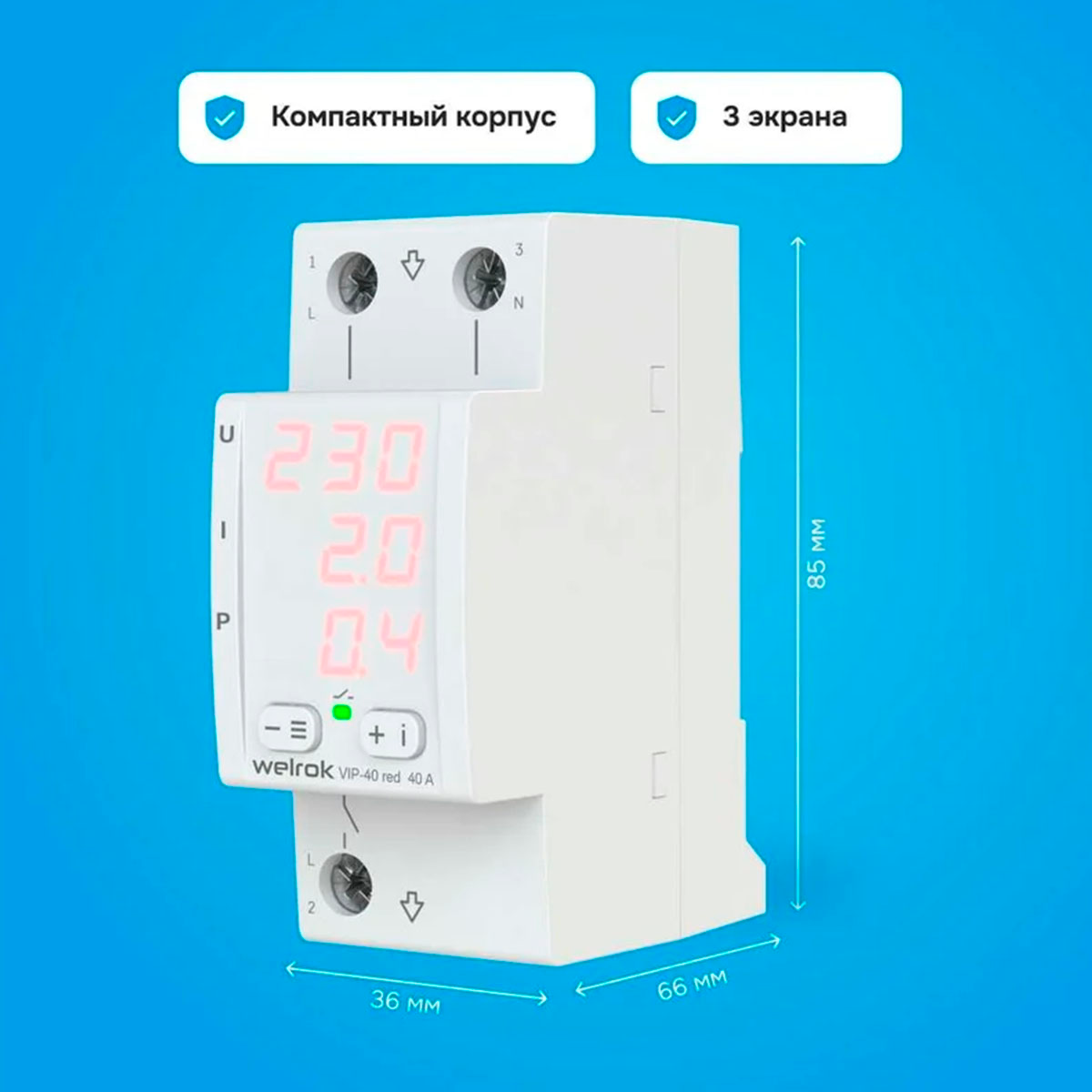Многофункциональное реле Welrok VIP red защищает оборудование от скачков и провалов напряжения, последствий обрыва нулевого провода и превышения тока или полной мощности. Реле отключает нагрузку, если напряжение, ток или мощность выходит за установленные пределы и автоматически включает нагрузку, когда значение параметра вернется в норму. Используется для уменьшения количества срабатываний:Защита от частых срабатываний.Регулируемый гистерезис.Регулируемая задержка включения нагрузки.Профессиональная модель отключения при выходе напряжения за пределы.