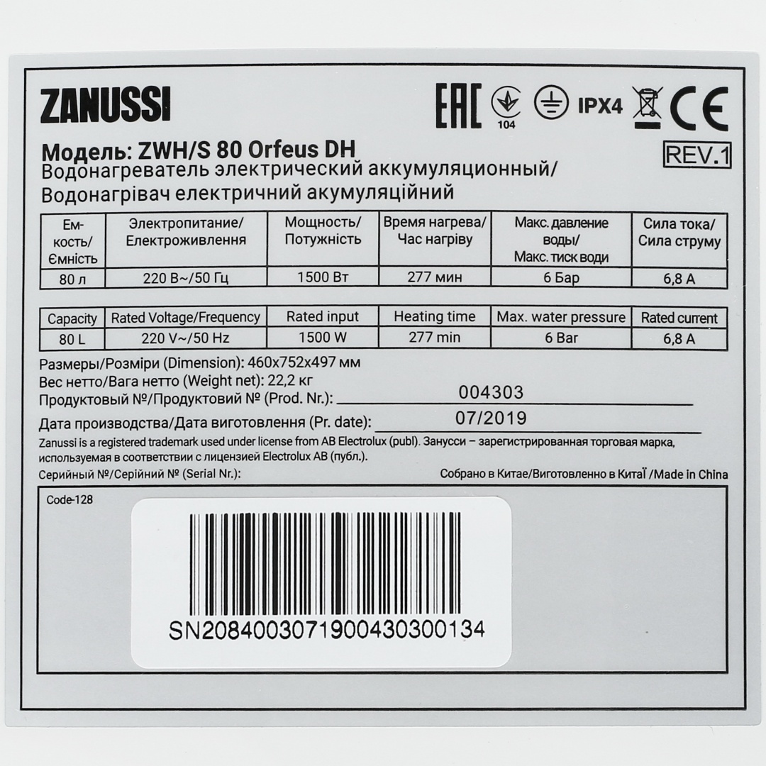 Водонагреватель Zanussi ZWH/S 80 Orfeus DH, 80 л, белый