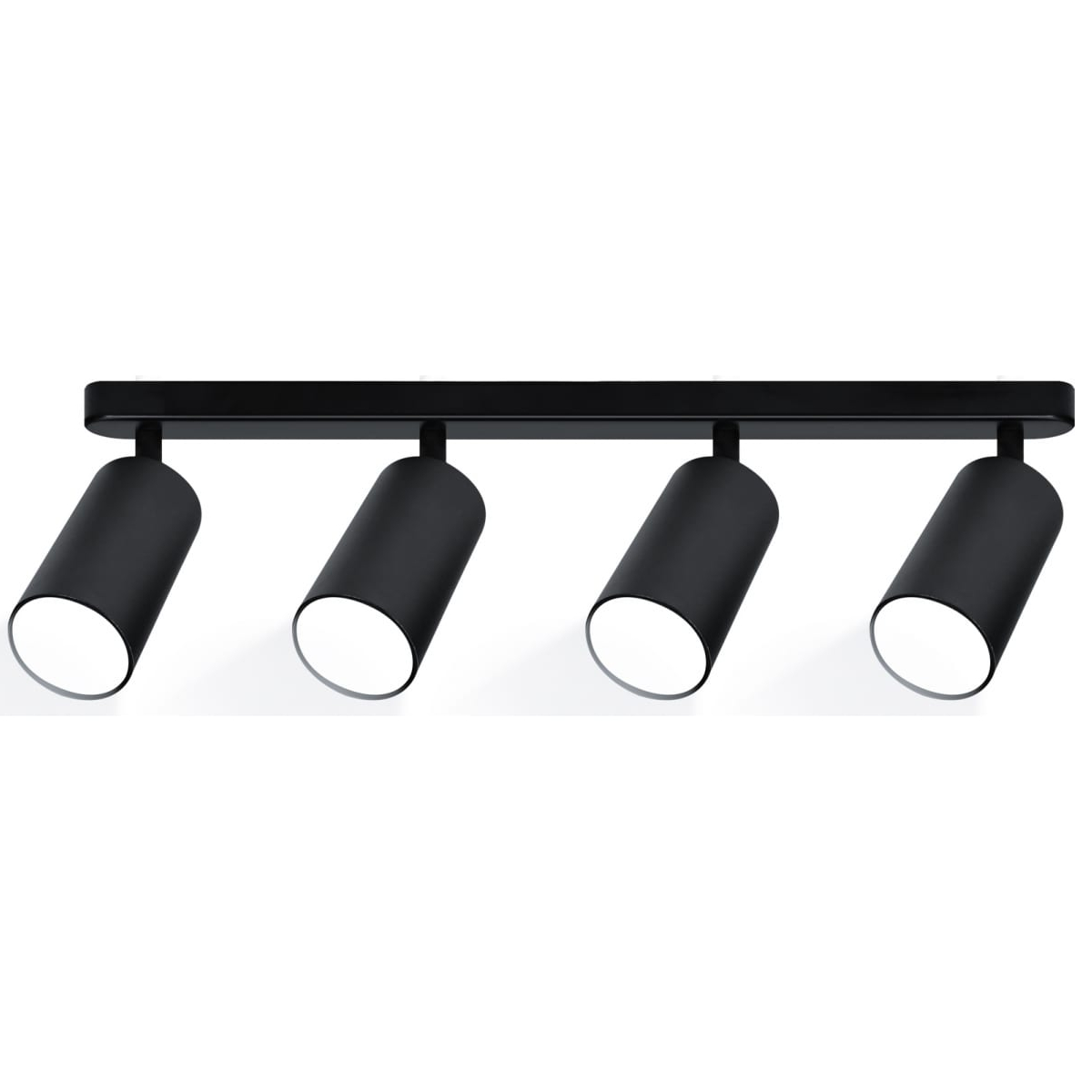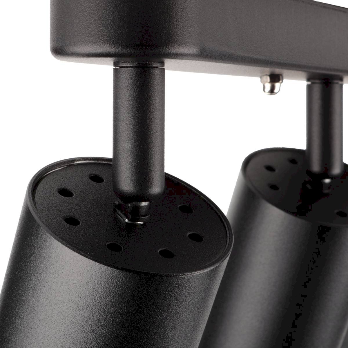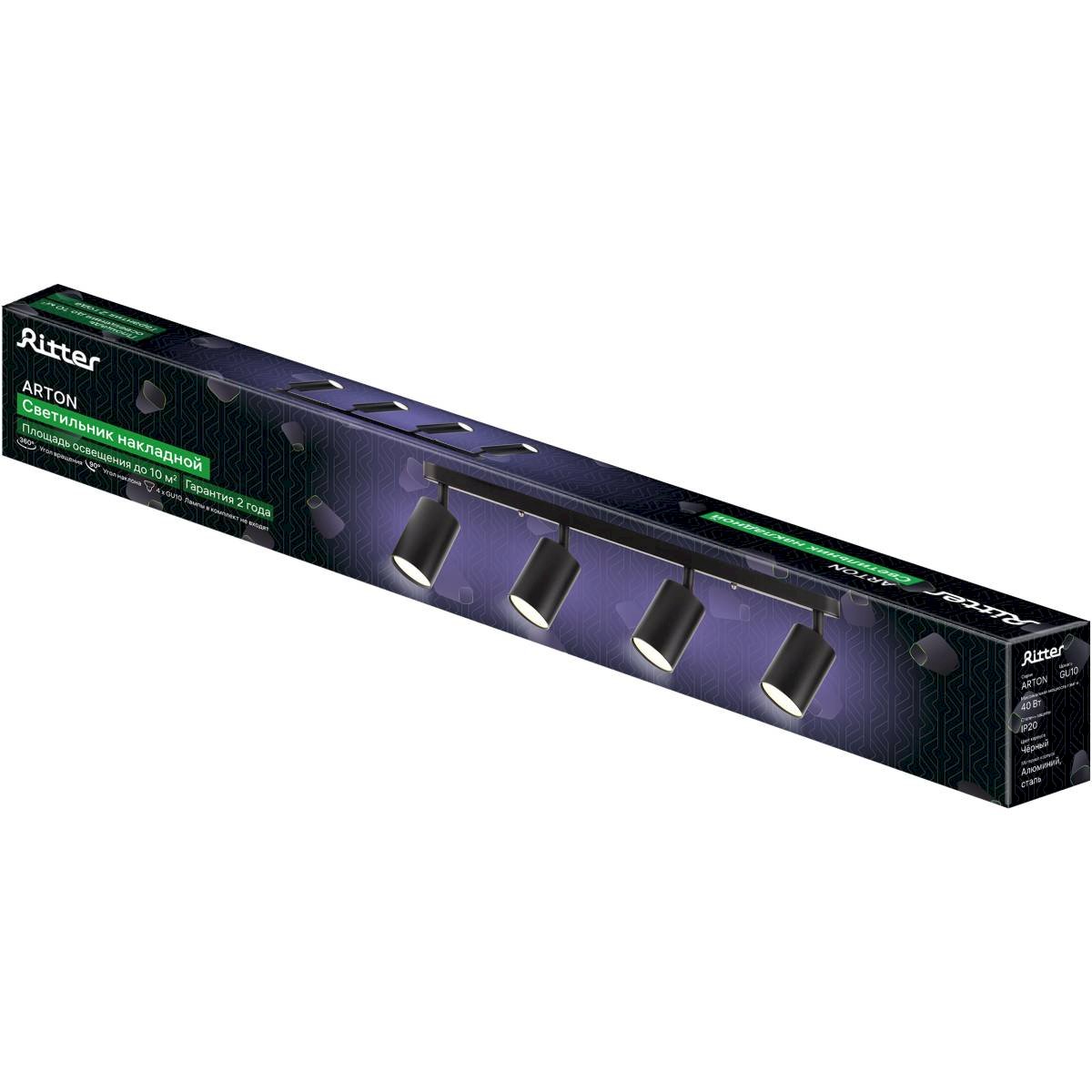 Накладной поворотный светильник RITTER Arton цилиндр алюминий 55x100x500 4хGU10 цвет черный 59936 4 предназначен для акцентного освещения интерьера. В светильнике предусмотрены четыре лампочки с цоколем GU10, максимальной мощностью 40 Вт. Светильник просто монтируется и надежно фиксируется.Спот можно использовать в качестве настенного светильника вместо традиционных бра. А также вешать как потолочный светильник. Строгие геометрические формы светильника позволяют использовать его как в классических, так и в современных дизайнерских интерьерах. Накладные светильники часто располагают в гостиных, коридорах, спальнях и детских в качестве дополнительного источника света. А в небольших помещениях накладной спот может являться основным источником освещения.Благодаря цилиндрической форме поворотных светильников, свечение ламп распределяется ярко и равномерно, что позволяет получить больше света от каждой лампочки.