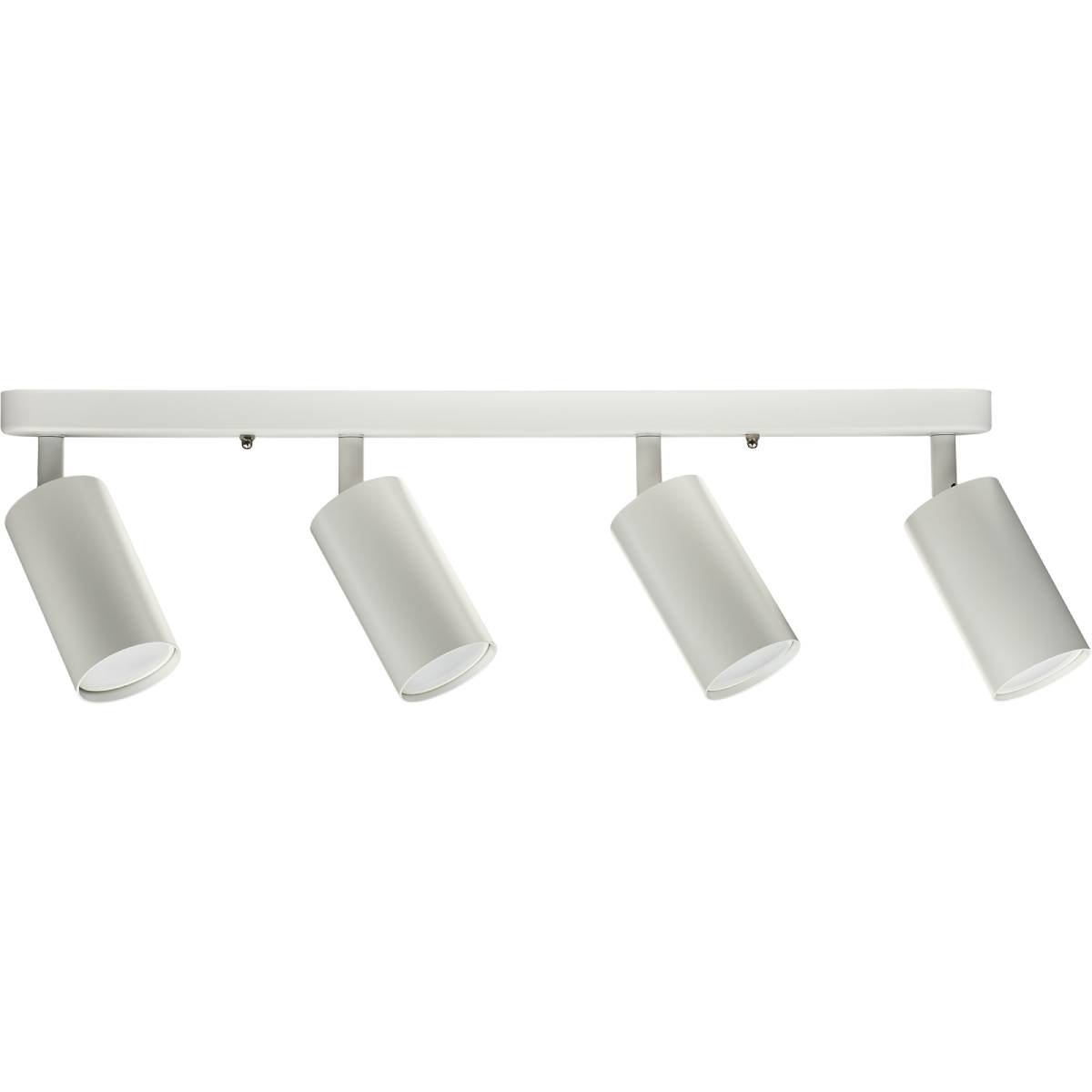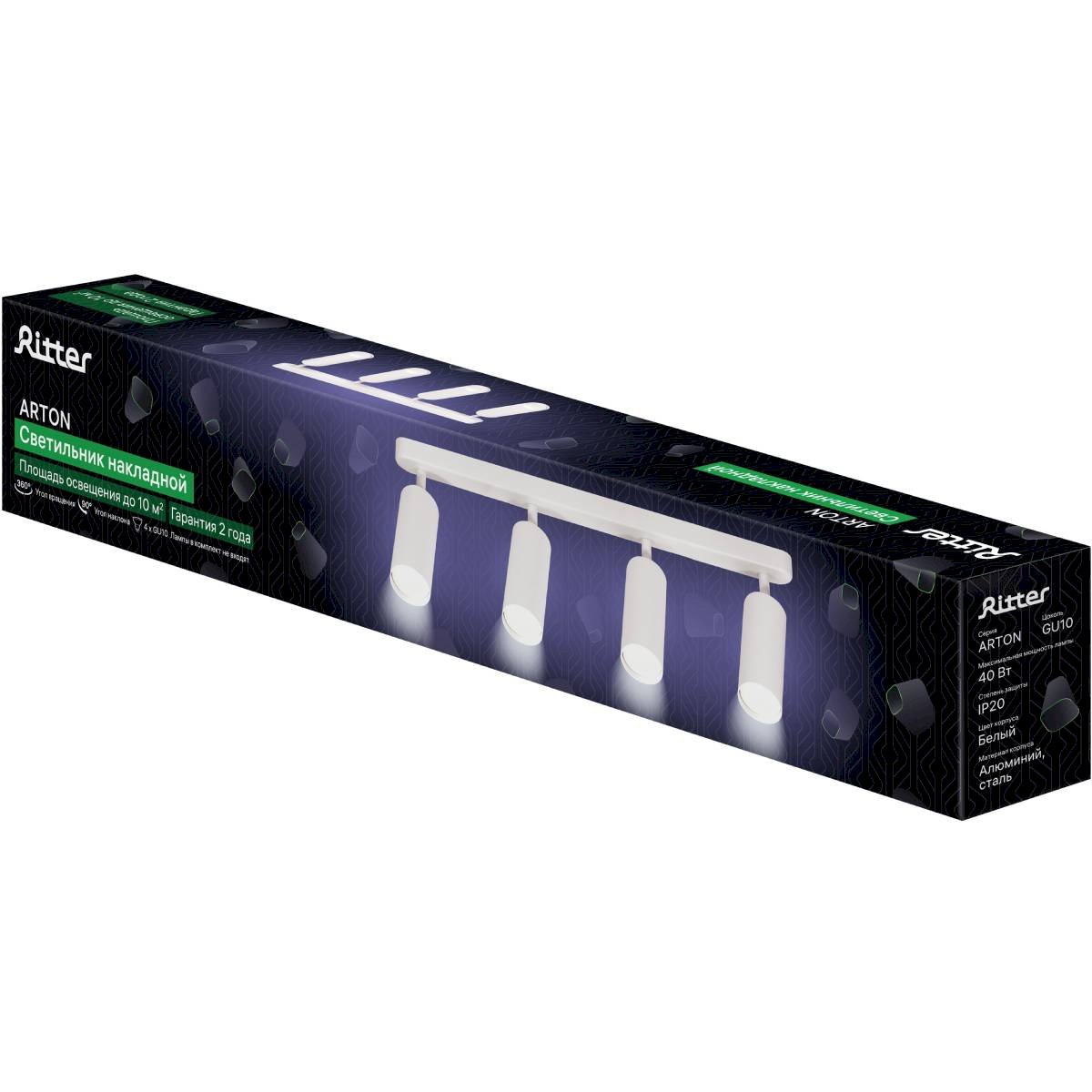 Накладной поворотный светильник RITTER Arton цилиндр алюминий 55x100x500 4хGU10 белый 59991 3 предназначен для акцентного освещения интерьера. В светильнике предусмотрены четыре лампочки с цоколем GU10, максимальной мощностью 40 Вт. Светильник просто монтируется и надежно фиксируется.Спот можно использовать в качестве настенного светильника вместо традиционных бра. А также вешать как потолочный светильник. Строгие геометрические формы светильника позволяют использовать его как в классических, так и в современных дизайнерских интерьерах. Накладные светильники часто располагают в гостиных, коридорах, спальнях и детских в качестве дополнительного источника света. А в небольших помещениях накладной спот может являться основным источником освещения.Благодаря цилиндрической форме поворотных светильников, свечение ламп распределяется ярко и равномерно, что позволяет получить больше света от каждой лампочки.