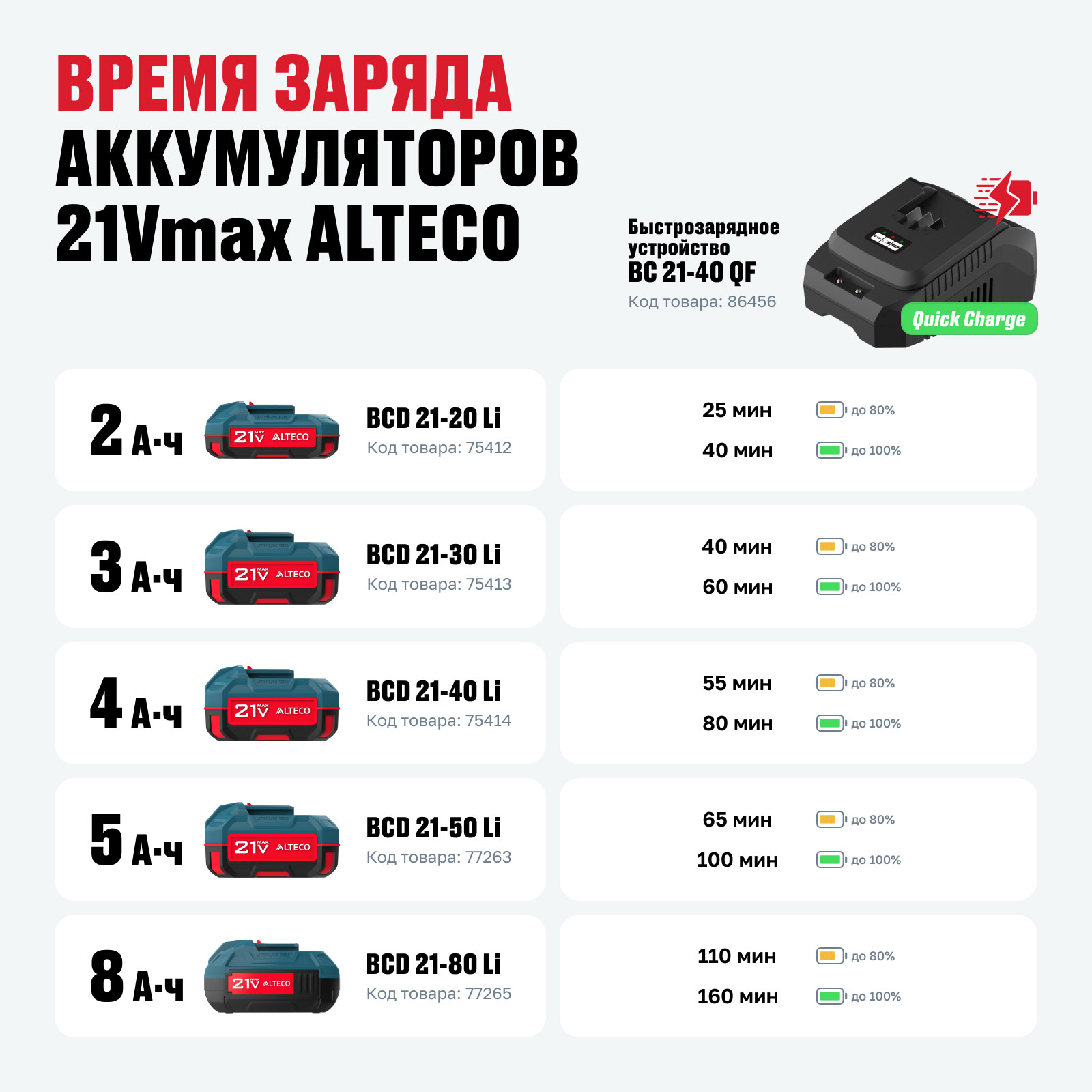 Аккумулятор ALTECO BCD 21-20 Li создан на базе высокопроизводительных литий-ионных ячеек SunPower и EVE, обеспечивая стабильную работу и долгий срок службы. Противоударный корпус защищает аккумулятор от падений, а защита от полного разряда и перегрева гарантирует долговечность и безопасность. Индикатор уровня заряда позволяет контролировать оставшуюся емкость, а отсутствие эффекта памяти позволяет заряжать аккумулятор в любое время. Быстрозарядное устройство ALTECO BC 21-40 QF совместимо со всеми аккумуляторами 21Vmax, обеспечивает зарядку до 80% всего за 25 минут, защиту от перегрева и перенапряжения, а также удобное настенное крепление.