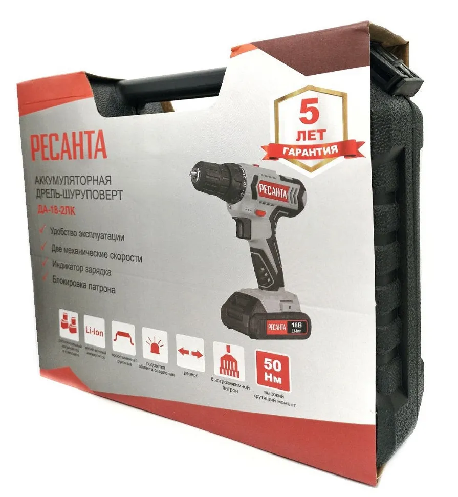 Дрель-шуруповерт аккумуляторная ДА-18-2ЛК Ресанта используется для просверливания отверстий в деревянных, пластмассовых и металлических изделиях или для работы в качестве шуруповерта. Модель оснащена 2 аккумуляторами и незаменима для людей, постоянно использующих дрели-шуруповерты в быту.Прорезиненная рукоять обеспечивает удобное и надёжное удержание инструмента в руке во время работы. Быстрозажимной патрон облегчает замену рабочей оснастки. Двухскоростной редуктор для удобства ведения различных работ. Реверсивный механизм предназначен для быстрого изъятия сверла из материала в случае застревания, выкручивания или ослабления крепежа. С помощью регулировки частоты вращения инструмент можно настроить под необходимую толщину материала. Модель работает от надёжного литий-ионного аккумулятора (Li-Ion).Преимущества:удлиненная форма устройства обеспечивает удобство при сверлении в труднодоступных местах, а также усиливает корпус позволяя закручивать крепеж с наименьшими трудозатратами;лёгкий вес и прорезиненная ручка обеспечивает комфортную работу даже при длительном использовании шуруповерта;возможность регулировки крутящего момента позволяет использовать шуруповерт для работы практически с любым материалом (дерево, металл, пластмасса);быстрозажимной патрон позволяет легко и быстро менять биты или сверла.Характеристики:Тип патрона: быстрозажимнойТип аккумулятора: Li-ionРежим работы: сверлениеЧисло скоростей: 2Емкость аккумулятора: 2 А/чКоличество аккумуляторов в комплекте: 2Максимальный диаметр сверления (дерево): 30 ммМаксимальный диаметр сверления (металл): 12 ммКрутящий момент: 50 Н/мНаличие реверса: даНапряжение аккумулятора: 18 В