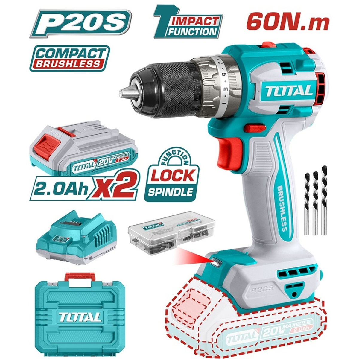 Литий-ионная компактная бесщеточная дрель 20В TOTAL TDLI20602 Бесщеточный двигатель Напряжение: 20 В Скорость холостого хода: 0-550/0-2000 об/мин. Максимальный крутящий момент: 60 Нм Металлический патрон Диаметр патрона: 13 мм Настройки крутящего момента: 22+1 Автоматический быстрозажимной патрон Механическая 2-ступенчатая коробка передач Функция блокировки шпинделя Встроенный светодиодный рабочий фонарь Включает в себя. 47 шт. аксессуаров 2 аккумуляторных батареи емкостью 2,0 Ач 1 шт. зарядное устройство Напряжение заряда: 220-240 В~50/60 Гц Упакован в футляр для переноски