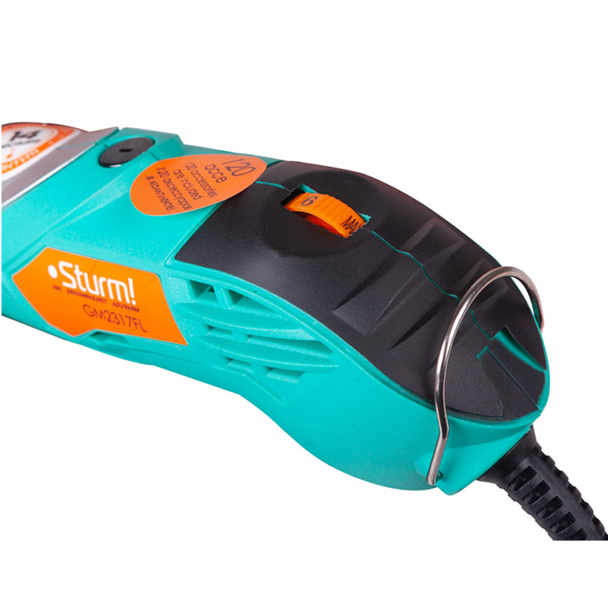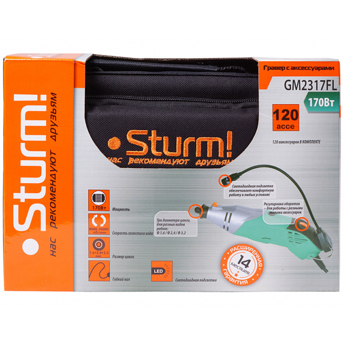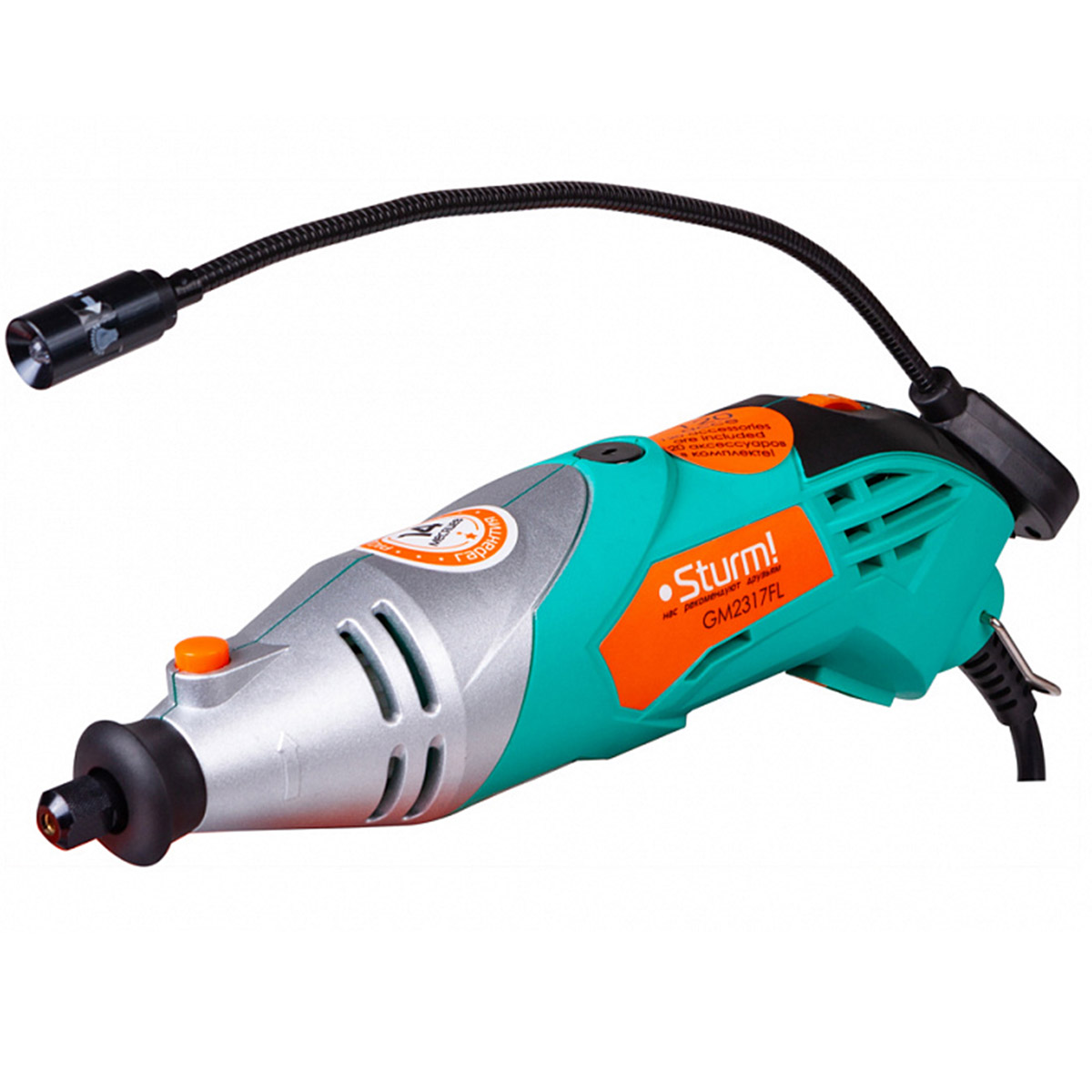Электрический гравер Sturm! GM2317FL – многофункциональное устройство, способное справиться с задачами различной сложности. Достаточно заранее определиться с нужным режимом работы, который выбирается на основе типа обрабатываемого материала. Практичная и универсальная модель со светодиодным светильником и богатой комплектацией насадок подходит для широкого применения. Инструмент может работать с металлом, камнем, стеклом, керамикой, деревом, пластиком и другими материалами. Ему доступна шлифовка, резка, фрезеровка, гравировка, сверление, полирование и зачистка поверхностей.Преимущества:Модель позволяет выбрать оптимальный технологический режим для конкретного вида материала с помощью предварительной установки скорости вращения вала плавным регулятором на верхней части корпуса.Светодиодный светильник c простым и удобным креплением на корпусе гравера используется для дополнительной подсветки рабочей зоны, повышая точность и комфорт работ.Система крепления насадок с использованием трех типовых диаметров фиксирующей цанги облегчает подбор оснастки и значительно расширяет диапазон применения инструмента.Эргономичный корпус из прочного пластика обеспечивает долгую и комфортную работу в любых условиях эксплуатации и лучший контроль над инструментом благодаря малому весу и удобной для обхвата форме.В комплекте с моделью поставляется расширенный диапазон из 120 аксессуаров в пластиковом органайзере, которые эргономично уложены вместе с основным инструментом в сумке-переноске.Характеристики:Напряжение питания (В): 220Набор оснастки (шт): 120Гибкий вал: ДаДлина кабеля питания (м): 1,2Регулировка оборотов двигателя: ДаМаксимальная мощность (Вт): 170Расширенная гарантия: ДаОбороты на холостом ходу (об/мин): 8000-32000Подсветка рабочей зоны: ДаДиаметр цанги (мм): 1.6/2.4/3.2
