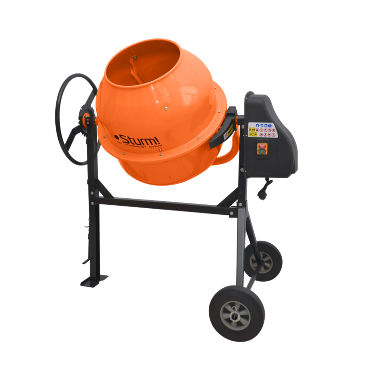 Надежная конструкция гарантирует безотказную работу бетоносмесителя продолжительное время.Мощный надежный асинхронный двигатель не требующий обслуживания.В производстве бака используется высококачественная сталь для глубокой вытяжки, аналогичная сталь применяется для кузовных элементов в машиностроении.Венец- серый чугун - уменьшает износ пары венец/шестерня и не требует дополнительной смазки.Стабильная работа привода с оптимальным охлаждением за счет конструктива привода.Быстрое изготовление готовой смеси согласно паспортным данным (в течение 2-х минут, после загрузки всех компонентов).Большой объем готовой смеси при непрерывном цикле работы.Наличие термореле в электродвигателе, который отключает электродвигатель при перегреве.Прочные транспортировочные колеса для удобного перемещения.Ножной механизм фиксации положения барабана, который позволяет удерживать маховик для выгрузки смеси двумя руками.В качестве покрытия используется порошковая краска, обеспечивает долговечность лако-красочного покрытияКонструкция бетоносмесители позволяет заменять подшипники, (необходимость в замене которых может возникнуть при не соблюдении правил эксплуатации).Основные характеристикиНапряжение питания: 220 ВГеометрический объем, не более: 180 лПривод опрокидывания: ручнойМаксимальная мощность: 1 000 ВтГабариты без упаковки: 1190х840х1275 ммКоличество оборотов барабана: 30 об/минЧастота: 50 ГцМаксимальная крупность заполнителей: 40 ммТип подключения: сетевая вилкаПринцип действия: гравитационныйВенец: чугунныйТип двигателя: электрическийВес инструмента в сборе без упаковки и аксессуаров (кг): 53,5Комплектация: Нижний полубак с венцомВерхний полубакДвигательЛопасти (2шт)Опора подшипникаТраверсаКолесная опораКолеса (2шт)Опорная ножкаФиксирующий дискПоворотное колесоКомплект крепежаДополнительный приводной ременьИнструкция по эксплуатации