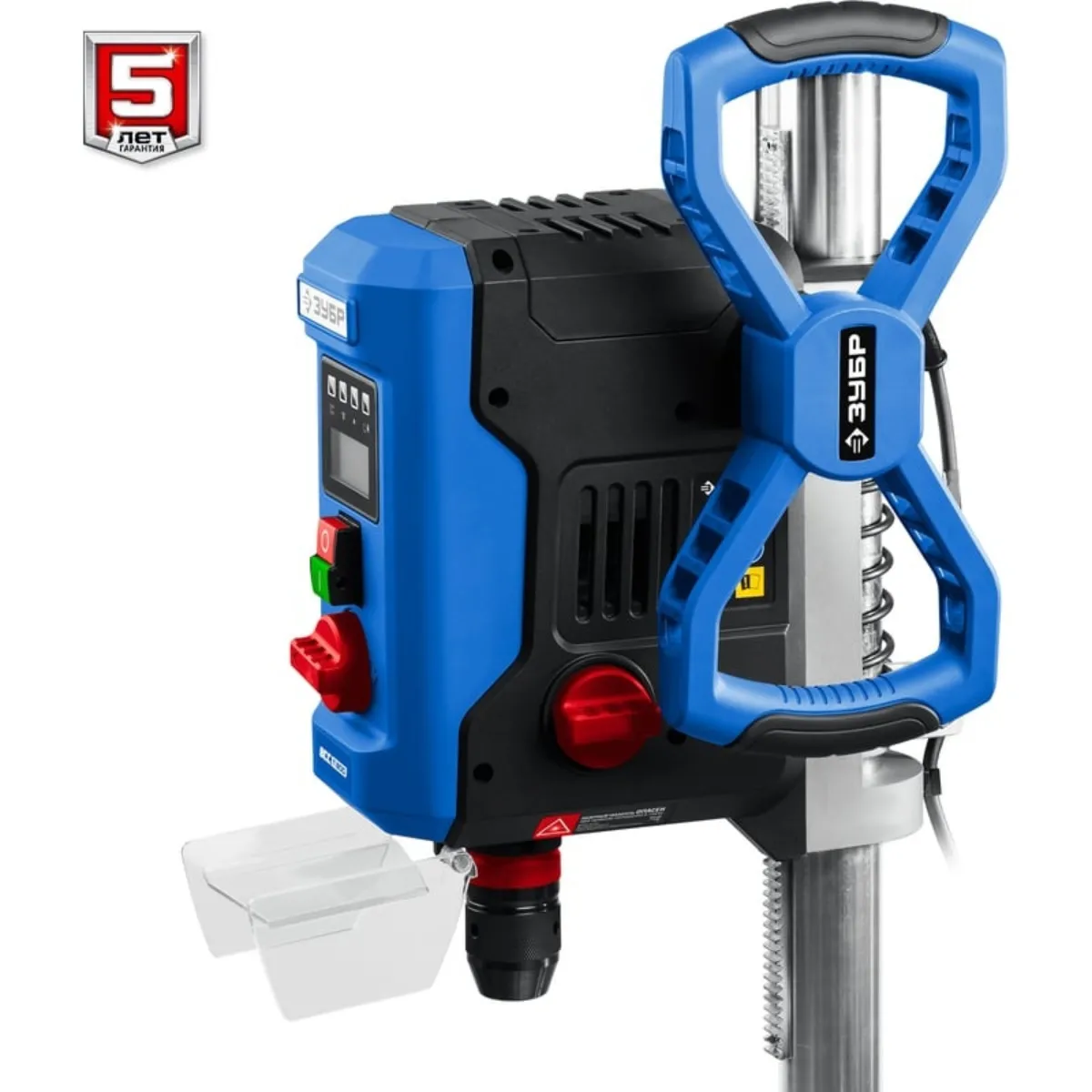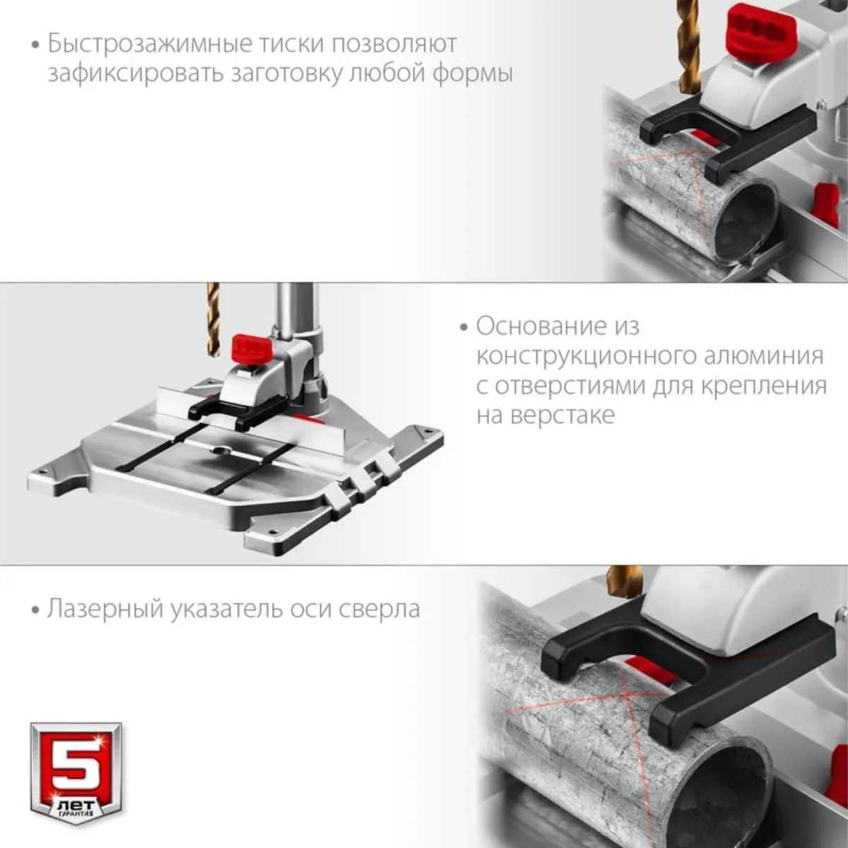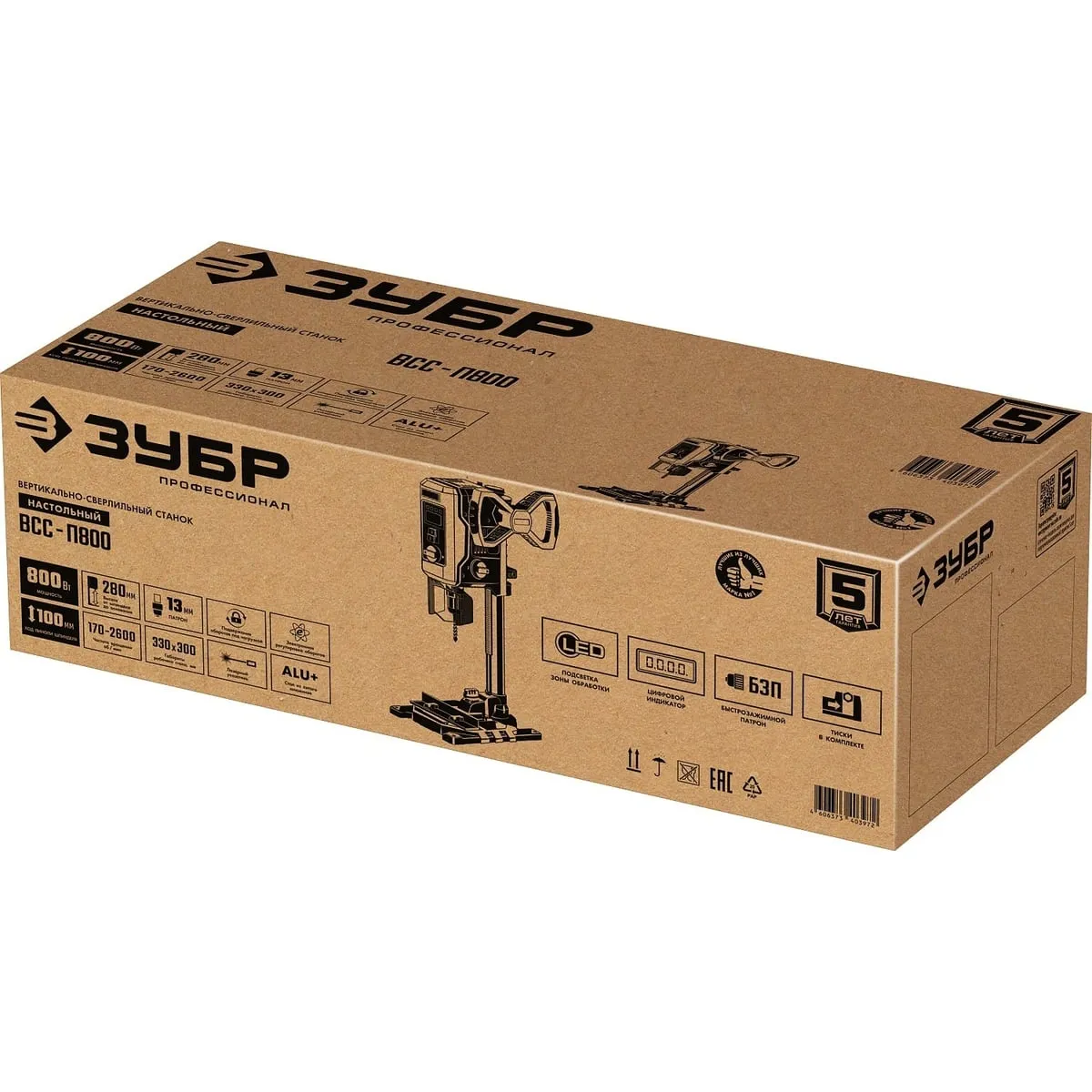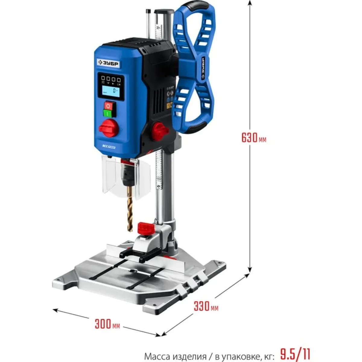 Профессиональный сверлильный станок для точных работ. Быстрое и качественное сверление отверстий в различных материалах (при установке соответствующих типов сверл). Электронный дисплей позволяет считывать информацию о текущей скорости и глубине сверления во время эксплуатации. Быстрозажимное устройство позволяет надёжно фиксировать даже круглые заготовки, обеспечивая высокую точность выполняемых отверстий. Лазерный указатель точно указывает точку вхождения сверла в материал, обеспечивая быстрое получение точного результата. LED подсветка рабочей зоны. Двухступенчатый редуктор позволяет подобрать оптимальные режимы для обрабатываемого материала.Преимущества:Электронная регулировка частоты вращения шпинделяДвухступенчатый редукторЭлектронный дисплейЛазерный указатель оси выполняемого отверстияLED подсветкаБыстрозажимные тискиБыстрозажимной патронВозможность сверления на заданную глубинуПрозрачный кожух для защиты оператора от стружки при сверленииИспользование: Для выполнения отверстий в заготовках из различных материалов (при установке соответствующих типов сверл)Характеристики:Габариты (д*ш*в) мм.: 330*340*650Лазерный указатель: даРазмер основания, мм :330*300Ход шпинделя, мм: 100Плавная регулировка оборотов: даВертикальное перемещение сверлильной головы, мм: 260Мощность, Вт: 800Диаметр сверла, мм: 1.5-13Расстояние шпиндель - стойка, мм: 125Максимальное расстояние шпиндель - основание, мм: 275LED подсветка: да