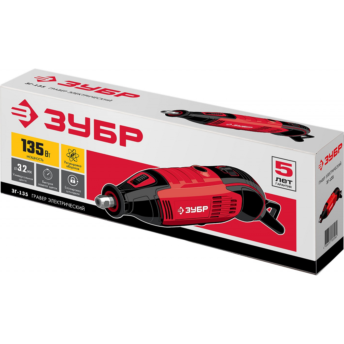 Электрический гравер ЗУБР ЗГ-135 помогает шлифовать, полировать, сверлить, фрезеровать и гравировать поверхности из дерева, стали, камня, плитки и т.д. Благодаря блокировке шпинделя заменить оснастку не составляет труда. Наружное расположение технического узла позволяет менять угольные щетки быстро и без использования дополнительных инструментов.ОсобенностиМногофункциональный инструмент с широким спектром примененияМалогабаритный и незаменимый инструмент, воплощающий идеи в реальностьИдеален для творческих работ, обработки мелких элементов и работы в труднодоступных местахЭргономичный дизайн, благодаря которому инструмент удобно лежит в рукеЭлектронная регулировка оборотов позволяет подобрать оптимальный режим для каждого вида работы и материаловПередняя часть корпуса совместима с насадками DremelБлокировка вала для быстрой замены инструментаМягкие накладки на корпусе позволяют надежно удерживать изделие в работе при любом хватеБыстрый доступ к щеткам для удобства заменыХарактеристикиМощность, Вт: 135Частота вращения, об/мин: 15000-35000Размер цанги, мм: 3.2Посадочный размер вала, мм: M8x0.75Напряжение, В/Гц: 230 /50Габариты, см: 32.6x6x11Масса изделия, кг: 0.65Гарантия: 1 год