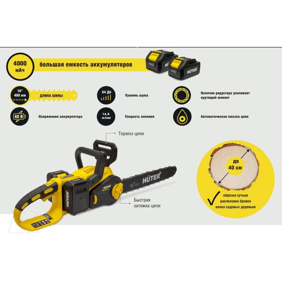 Электропила аккумуляторная Huter ELS-40-4Li - цепная аккумуляторная пила, предназначенная и для продольного и для поперечного распила древесины диаметром до 400 мм, распиловки брёвен, валки садовых деревьев и спиливания веток и т.п.Особенности:Пила цепная электрическая оснащена редуктором, благодаря чему крутящий момент усиливается.Электропила оснащена тормозом цепи.В комплект цепной пилы входят 2 аккумулятора.Характеристики:Напряжение аккумулятора: 40 В.Емкость аккумулятора: 4000 мАч.Длина шины: 400 мм.Скорость пиления: 14.6 м/сек.Быстрая затяжка цепи: да.Автоматическая смазка цепи: да.