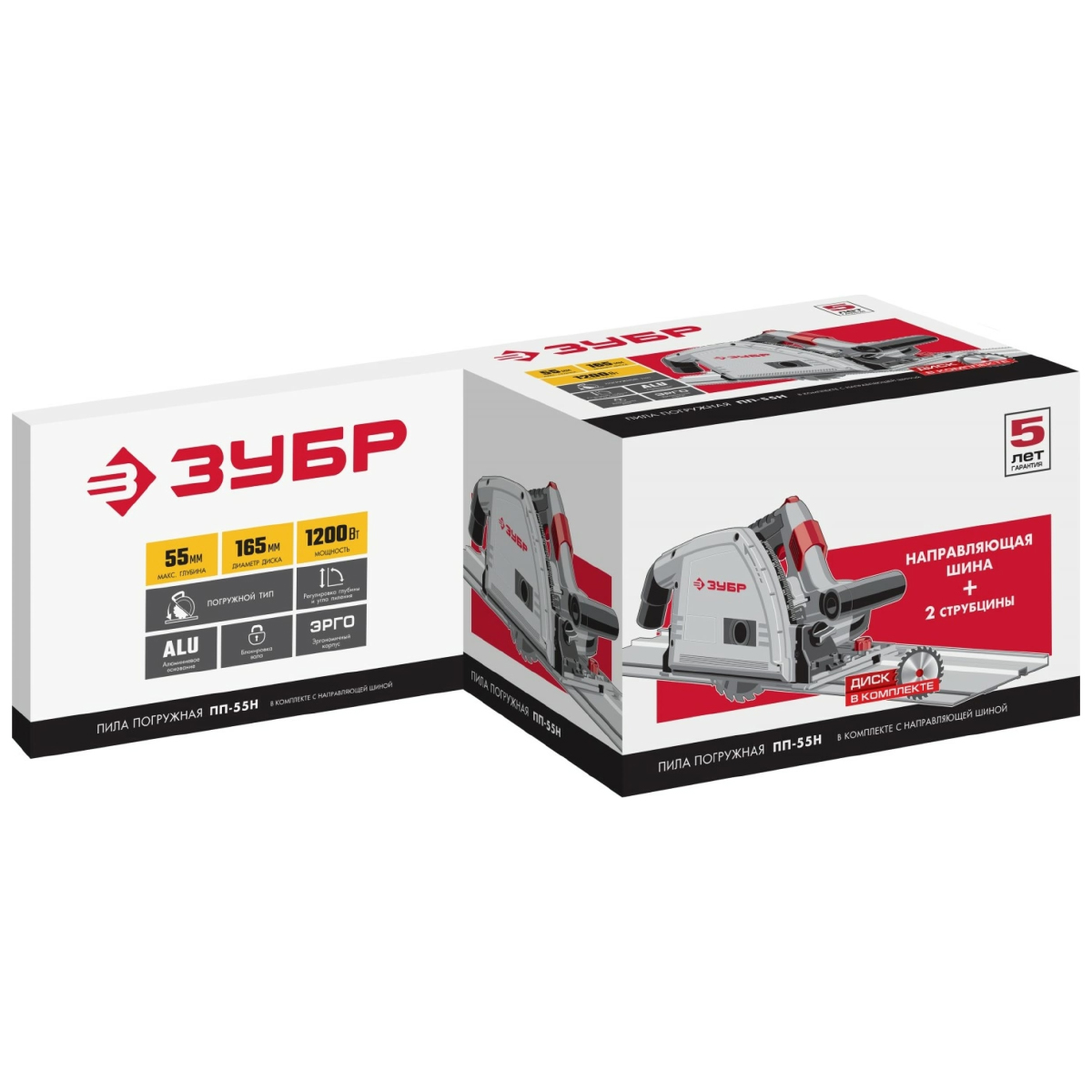 Пила погружная ЗУБР ПП-55Н, предназначена для распиловочных работ по дереву и иным материалам (при установке соответствующего диска) под различными углами, а также под наклоном. Направляющие шины в комплекте - возможность точного пиления без дополнительных затрат. Функция погружения позволяет выполнять внутренние пропилы в поверхностях. Полностью скрытый пильный диск предохраняет оператора от травм, а также снижает запыленность и шум. Бесступенчатая регулировка глубины и угла пиления для точных работ. Основание из литого алюминия с профилированием для использования с направляющей шиной. Шкала глубины пиления имеет отметки уровня при работе с направляющей шиной или без нее. Рычаг фиксации шпинделя для простой замены диска. Защитная блокировка выключателя для дополнительной безопасности. Дополнительная рукоятка под естественный хват обеспечивает удобство и полный контроль во время работы. Два патрубка пылеотвода с разными диаметрами для подключения любого пылесоса.Комплектация:Пила дисковая - 1 шт. Диск (установлен) - 1 шт. Направляюща шина 18х70 см - 2 шт. Соединитель направляющих - 1 шт. Зажим (струбцина G-образная) - 2 шт. Патрубок пылеотводный D32, D35 - 2 шт. Ключ имбусовый - 2 шт. Руководство по эксплуатации - 1 шт. Характеристики:Тип пилы: погружнойТип двигателя: щеточныйКласс: профессиональныйПараметры сети: 220/50Питание: сетевойМощность: 1200Диаметр диска: 165Посадочный диаметр диска: 20Max глубина пропила под углом 90: 55 ммПлавный пуск: нетПоддержание постоянных оборотов под нагрузкой: нет