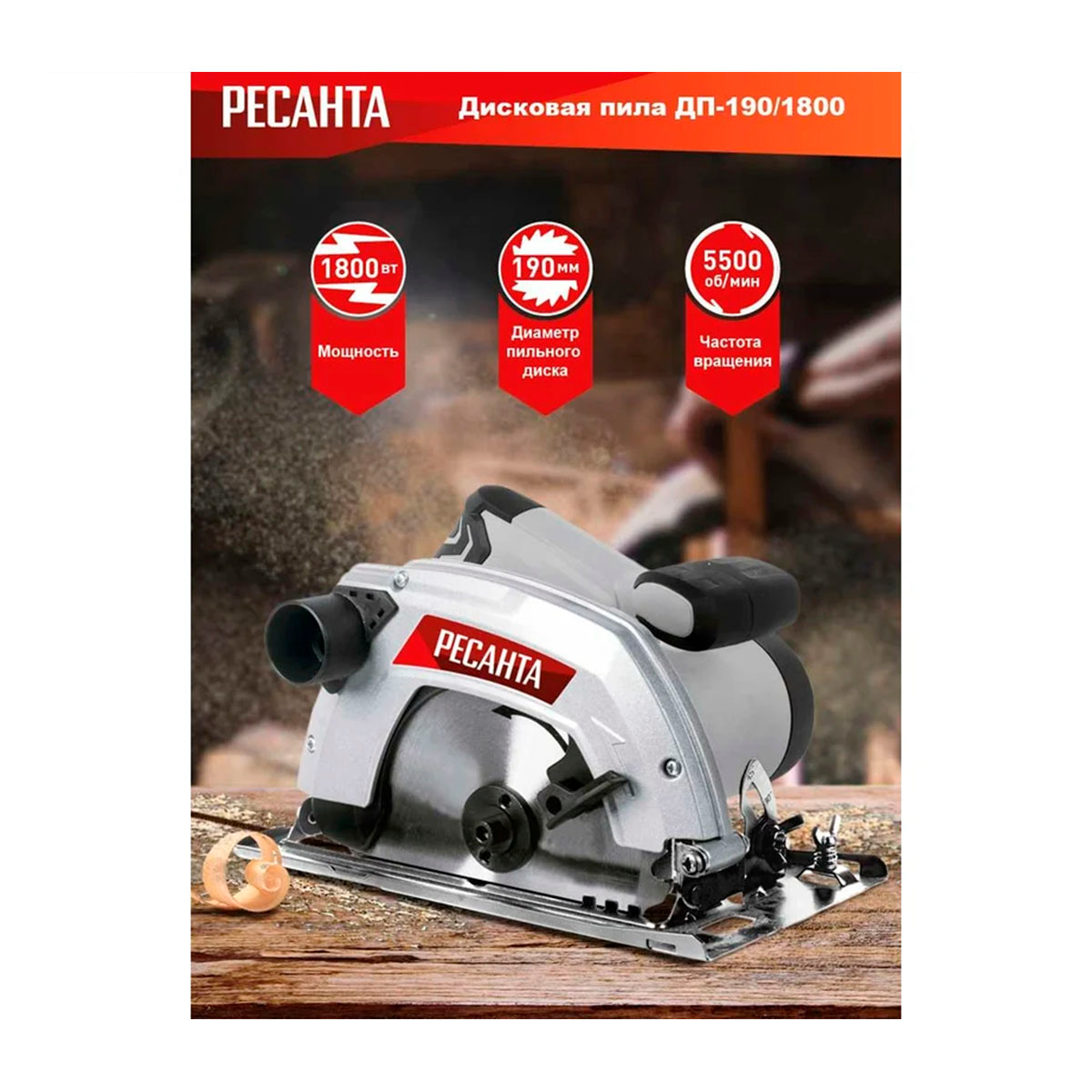Дисковая пила ДП-190/1800 Ресанта – позволяет делать пропил глубиной до 68 мм. Небольшой вес и размер гарантируют удобство при транспортировке. Пила дисковая (циркулярная) Ресанта– ручной электроинструмент для прямолинейного распила дерева, а при использовании специальных пильных дисков можно качественно и быстро раскраивать плотные листовые материалы (ламинат, бакелитовую или обычную фанеру), цветные металлы, пластик. Дисковые пилы относятся к технике с приводом от электрического двигателя. Двигатель через редуктор передает крутящий момент на пильный диск.Преимущества:прорезиненная рукоятка эргономичной формы;верхний кожух с отводом стружки;плавающий нижний кожух с возвратной пружиной;опорная плита с регулировкой угла наклона;регулятор глубины пропила;крепеж параллельного упора.Комплектация: дисковая пила, пильный диск, параллельная направляющая, ключ шестигранный, паспорт (инструкция), упаковка.Характеристики:Мощность: 1800 ВтТип пилы: циркулярнаяНаружный диаметр: 190 ммМакс. обороты: 5500 об/минТип: циркулярная пилаГлубина пропила: 68 ммВес нетто: 3.80 кг