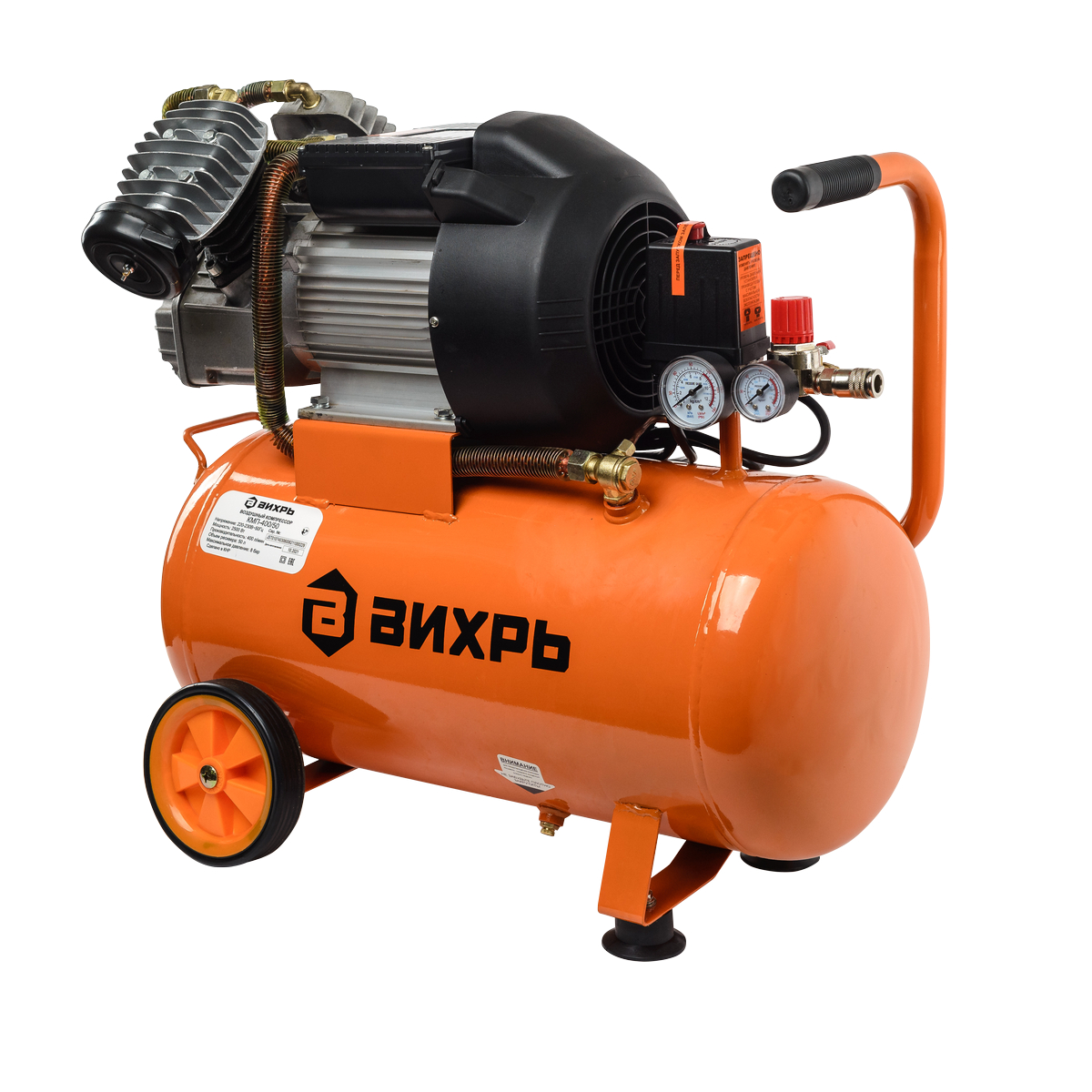 Компрессор ВИХРЬ КМП-400/50 - новинка 2019 года. Позволяет нагнетать сжатый воздух в пневмооборудование и пневмоинструменты. Вихрь КМП-400/50 используется для выполнения механических работ широкого плана.Компрессор имеет высокую мощность 2500 Вт, благодаря которой на выходе получается давление 8 бар - это весьма хорошие показатели для современных компрессоров.Производительность модели ВИХРЬ КМП-400/50 составляет 400 л/мин, при объеме ресивера 50 л. Имеются специальные ножки с резиновыми накладками для лучшей устойчивости. Удобная транспортировка компрессора достигается за счёт 2-х колес, идущих в комплекте.Особенности:Оснащен регулятором давления, благодаря которому возможно изменять давление воздуха в диапазоне от 1 до 12,5 атм;Манометры позволят визуально контролировать давление в ресивере и на выходе из редуктора;Встроенное реле давления обеспечит работу компрессора в автоматическом режиме;Снабжён ручкой и двумя колесами для более удобной транспортировки;Уровень масла в любой момент можно проверить через специальное окно;Имеется воздушный фильтр для очистки всасываемого воздуха и предохранения поршневой группы от пыли и посторонних частиц.Важно: По окончании работы выпускайте воздух из ресивера. По мере загрязнения меняйте фильтрующий элемент, но не реже, чем через каждые 500 часов работы. Категорически запрещается смешивать различные сорта масла.