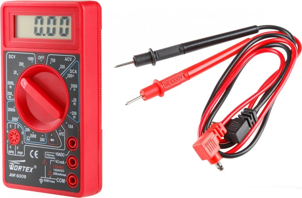 Мультиметр цифровой WORTEX AM 6009 относится к многофункциональным электронным измерительным приборам. Изделие широко используется как в домашнем хозяйстве, мастерских, так и в лабораториях. Прибор имеет все необходимые функции для бытового использования, оснащен небольшим цифровым дисплеем, на который выводятся результаты измерений. Прост и удобен в обращении, а также защищен от перегрузки. Источник питания: 9В ("Крона").Функции:- Измерение постоянного напряжения; - Измерение переменного напряжения; - Измерение постоянного тока; - Измерение сопротивления;- Диодный тест; - Транзисторный тест.Показатели измерения:Постоянное напряжение: 200 мВ/2 В/20 В/200 В/1000 В; Переменное напряжение: 200 В/750 В; Постоянный ток: 200 мкА/2000 мкА/20 мА/200 мА/10 А; Сопротивление: 200 Ом/2000 Ом/20 кОм/200 кОм/2000 кОм; Источник питания: 9В (); Габаритные размеры, мм: 126 х 70 х 24; Вес, г: 150.Комплектация:- Комплект измерительных щупов, 1 шт. - Батарея 9 В, 1 шт. - Инструкция по эксплуатации, 1 шт.