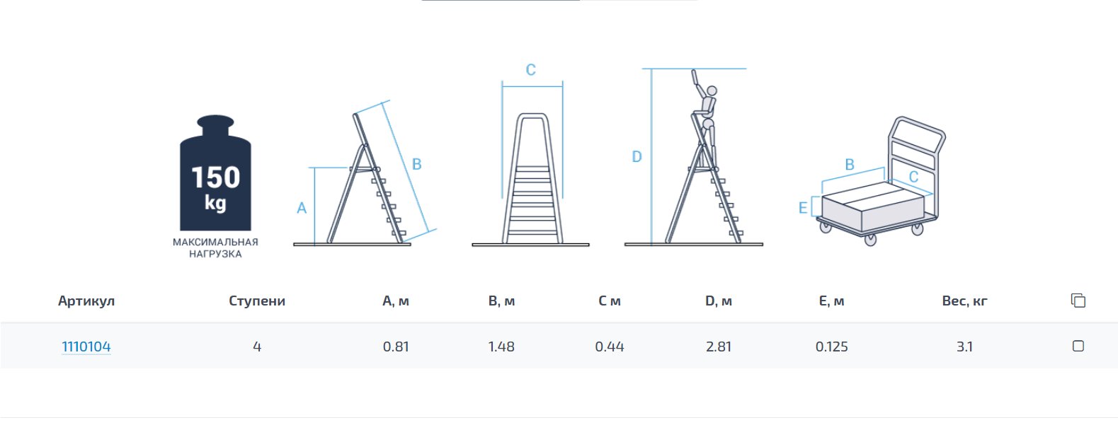 Высокая прочность и надёжность при небольшом весе изделияЛегко устанавливается и обеспечивает высокий уровень комфортаСтойки и ступени из экструдированных алюминиевых профилейСтупени глубиной 80 ммРифлёная поверхность ступеней для безопасного подъёма и спускаПрочное крепление ступеней к боковинам шестью заклёпками для более высокой устойчивости конструкцииРифлёная площадка из оцинкованной сталиДуга безопасности 600 ммПрочные страховочные ремни Опорные наконечники из прочного пластика для устойчивого положенияКомпактность при хранении и транспортировкеПрактичность и внимание к каждой детали гарантируют безопасность работы на любой высотеРабочая высота: 281 смМаксимальная нагрузка: 150 кг