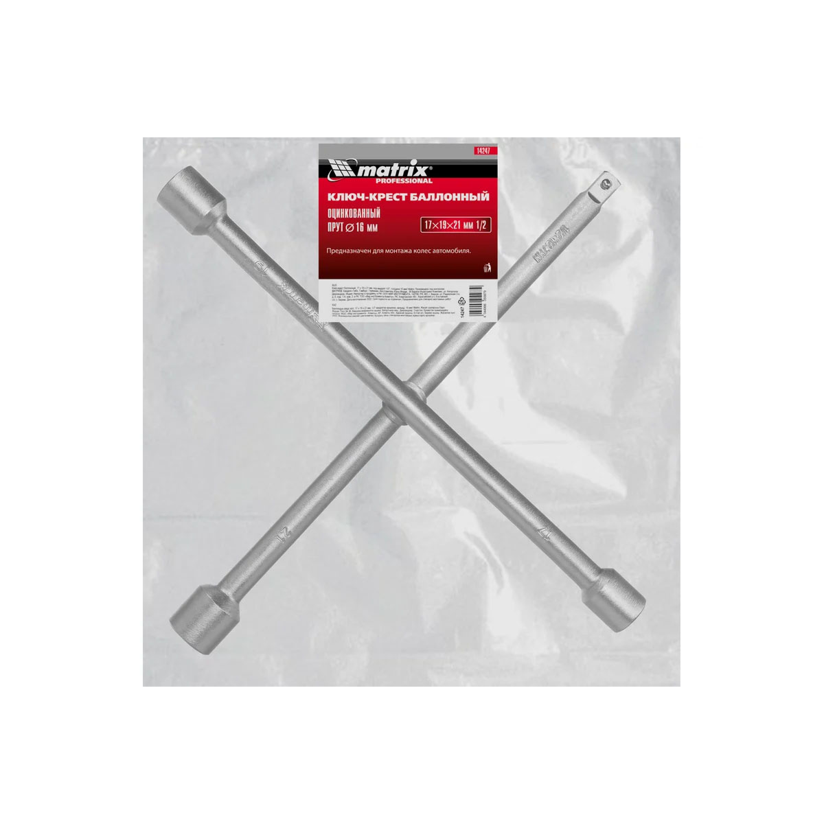 Баллонный ключ-крест MATRIX, 14247, толщина 16 мм - это специализированный инструмент, необходимый при замене колес автомобиля для вкручивания и выкручивания соединительных болтов. Ключ-крест изготавливается из углеродистой стали и имеет 3 несъемные торцевые головки с 6-гранным зевом и присоединительный квадрат 1/2. Твердость материала рабочих частей ключа соответствует требованиям ГОСТа.Длина: 355 ммРазмер: 17х19х21 ммРазмер посадки: 1/2 дюймаМатериал: углеродистая стальТип ключа: крестовой