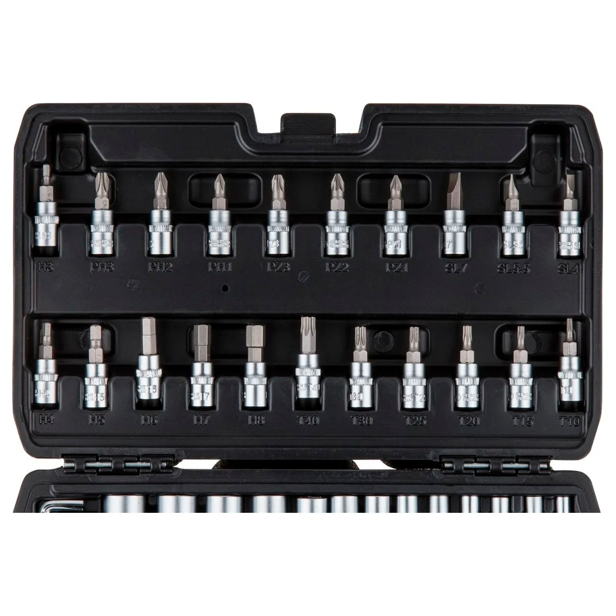 Набор инструмента STARTUL из 46 предметов подойдет для широкого круга слесарных, монтажных, ремонтных работ. Инструменты прослужат долго. Они изготовлены из хромованадиевой стали 50BV30 с сатинированной поверхностью. Это обеспечивает их долговечность при интенсивном использовании, а также при воздействии воды, масла или топлива. Набор включает шестигранные торцевые головки и головки-биты c различными шлицами, чтобы работать с широким диапазоном крепежных соединений. Трещотка изогнутой формы с храповым механизмом на 72 зуба обеспечивает исключительную мягкость и плавность в работе. Воротки и удлинители 50 и 100 мм облегчают работу в труднодоступных местах.