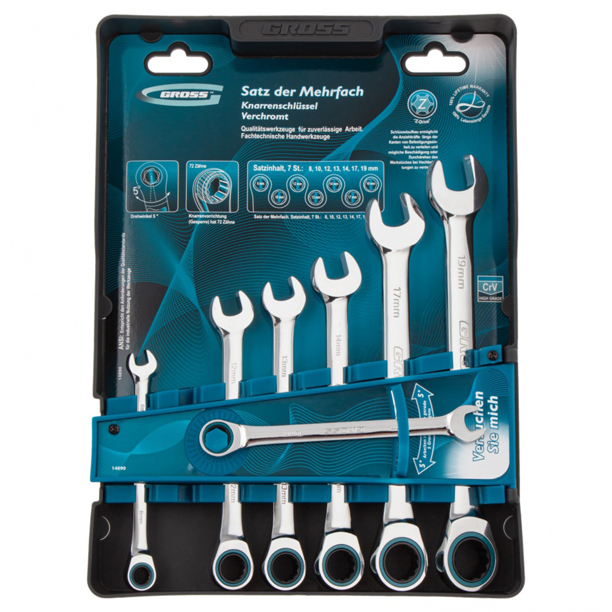 Набор комбинированных ключей с трещоткой Gross 14890 используется для монтажа и демонтажа болтов и гаек и включает 7 инструментов размером от 8 до 19 мм, выполненных из стали CrV. Каждый из них имеет две рабочие головки – рожковую и накидную, что расширяет возможности применения. У накидной головки 12-гранный профиль, благодаря чему она надежно захватывает крепеж. Набор подходит как для профессионального, так и для самостоятельного ремонта автомобилей.Преимущества:Прочность и повышенная твердость – ключи изготовлены из высококачественной стали хромованадиевой группы.Долговечность – хромоникелевое покрытие предохраняет инструменты от коррозии.Высокий ресурс – твердость материала трещотки составляет 43-47 HRC, поэтому она устойчива к интенсивным нагрузкам.Удобная работа даже в труднодоступных местах – храповый механизм с 72 зубцами обеспечивает плавную и быструю работу с резьбовыми соединениями (угол отклонения трещотки составляет всего 5 градусов).Характеристики:Форма: прямойКоличество предметов: 7Размер 1: 8 ммРазмер 2: 19 ммОсобенности: с трещоткой
