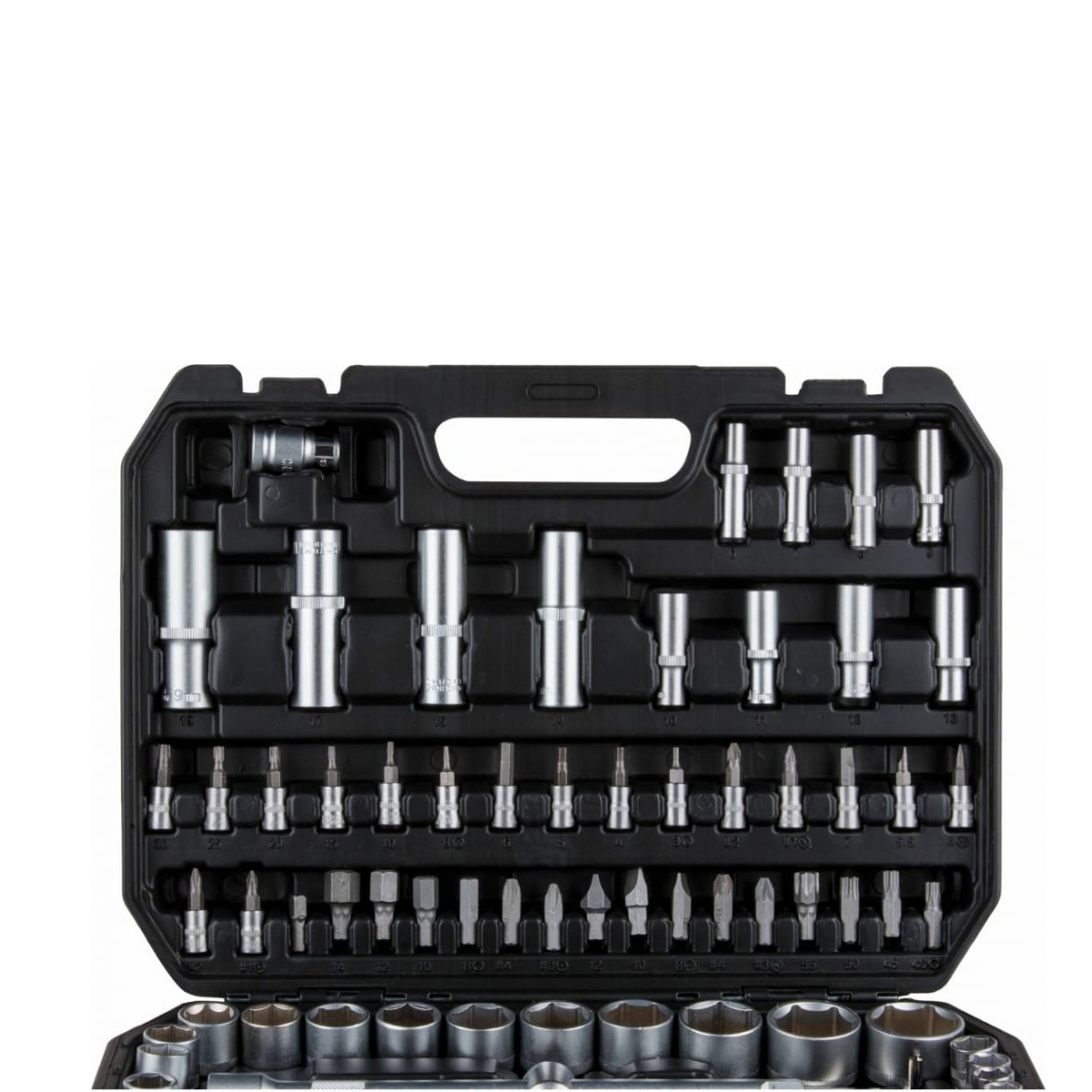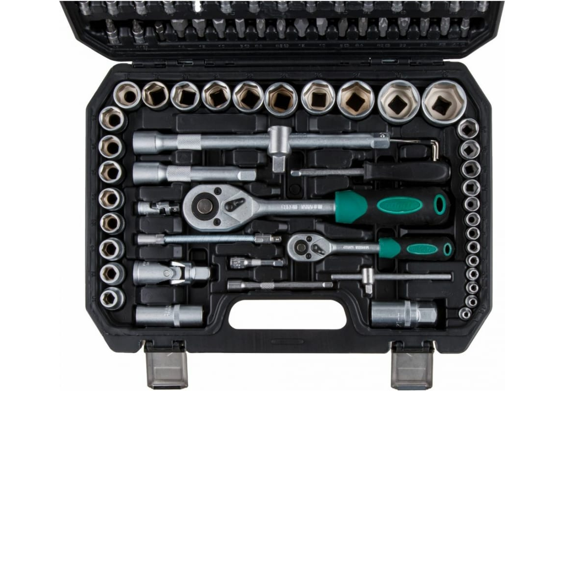 Набор инструментов ВОЛАТ 18510-94 включает в себя типовые элементы - облегчает работу монтажника или ремонтника.Комплектация (94 предмета):Головка торцевая1/4": 4, 4.5, 5, 5.5, 6, 7, 8, 9, 10, 11, 12, 13, 14 мм;Головка торцевая длинная 1/4": 6, 7, 8, 9, 10, 11, 12, 13 мм;Головка с насадкой HEX 1/4": H3, H4, H5, H6;Головка с насадкой TORX 1/4": T8, T10, T15, T20, T25, T30;Головка с насадкой SL 1/4": SL4, SL5.5, SL7;Головка с насадкой PH 1/4": PH1, PH2;Головка с насадкой PZ 1/4": PZ1, PZ2;Головка торцевая 1/2": 10, 11, 12, 13, 14, 15, 16, 17, 18, 19, 20, 21, 22, 23, 24, 27, 30, 32 мм;Головка торцевая длинная 1/2": 14, 15, 17, 19, 22 мм;Свечная головка 1/2": 16, 21 мм;Насадка 5/16" HEX: H8, H10, H12, H14;Насадка 5/16" TORX: T40, T45, T50, T55;Насадка 5/16" SL: SL8, SL10, SL12;Насадка 5/16" PH: PH3, PH4;Насадка 5/16" PZ: PZ3, PZ4;Трещотка 1/4";Переходник 1/4" под шуруповерт;Удлинитель 1/4" 50 мм;Удлинитель 1/4" 100 мм;Кардан 1/4";Вороток-отвертка 1/4" 150 мм;Вороток 1/4" с плавающей головкой 115 мм;Гибкий удлинитель 1/4";Трещотка 1/2";Переходник (держатель для бит) 1/2"х5/16"(HEX);Удлинитель 1/2" 125 мм;Удлинитель 1/2" 250 мм;Кардан 1/2";Переходник 3/8"х1/2" с отверстием;Ключ шестигранный Г-обр.: 1.5, 2, 2.5 мм;Кейс.