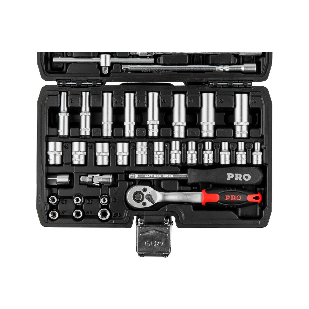 Набор инструментов STARTUL PRO Stuttgart 1/4" 6 граней 56 предметов PRO-056S Многофункциональный набор инструментов предназначен для ремонта и обслуживания автомобиля, а также для выполнения других слесарных работ. Рабочие части изготовлены из хромованадиевой стали, устойчивы к коррозии. Финишная обработка головок сатинированием обеспечивает высокую прочность и долговечность. Кейс из прочного противоударного пластика с металлическими замками гарантирует надежное хранение и транспортировку инструментов.