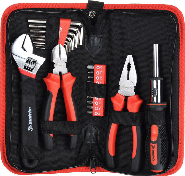 Набор слесарно-монтажный Matrix 13561, состоящий из 22 предметов: бокорезов, плоскогубцев, разводногоключа, отвертки реверсивной, переходника, восьми ключей-шестигранников и бит PH 0, PH 1, PH 2, SL 4, SL 5, SL 6, T 10, T1 5, T 20 предназначен для выполнения строительных и бытовых работ по дому различной сложности. Все инструменты выполнены из высокопрочных материалов и имеют долгий срок службы.