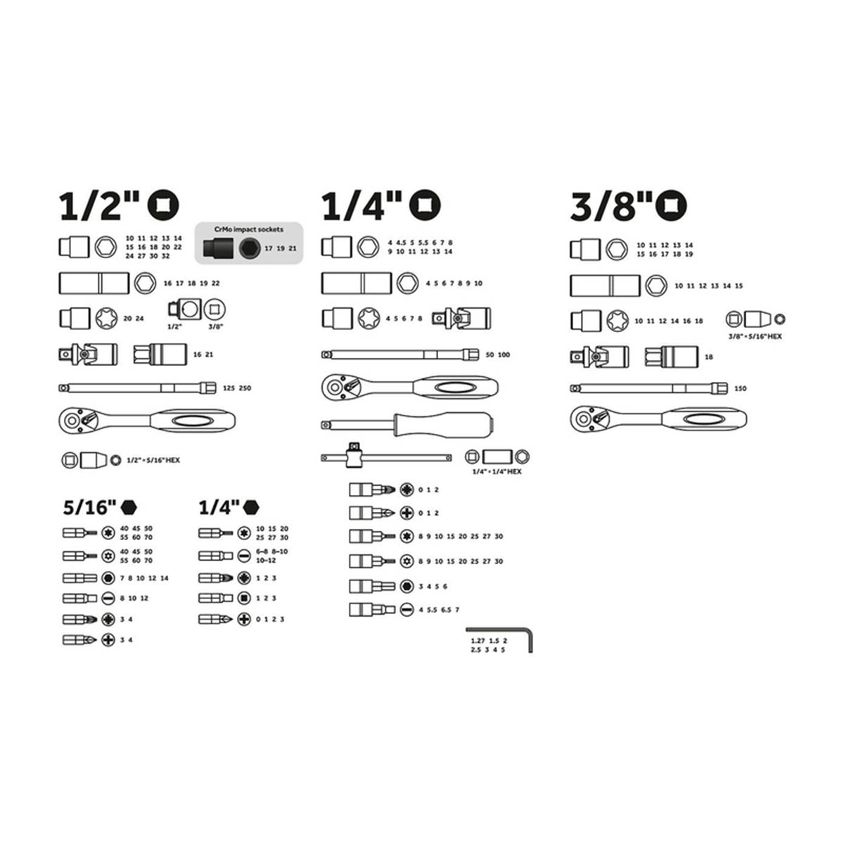 Технические характеристики:Назначение многофункциональный набор предназначен для ремонта и обслуживания автомобиляМатериал рабочие части изготовлены из хромованадиевой стали, устойчивы к коррозии, ударные головки 1/2" 17, 19, 21 мм изготовлены из хромомолибденовой сталиФинишная обработка головок сатинированиеПрофиль головок шестигранныйТрещоточный механизм45 зубьевКейс из прочного противоударного пластика, с металлическими замками