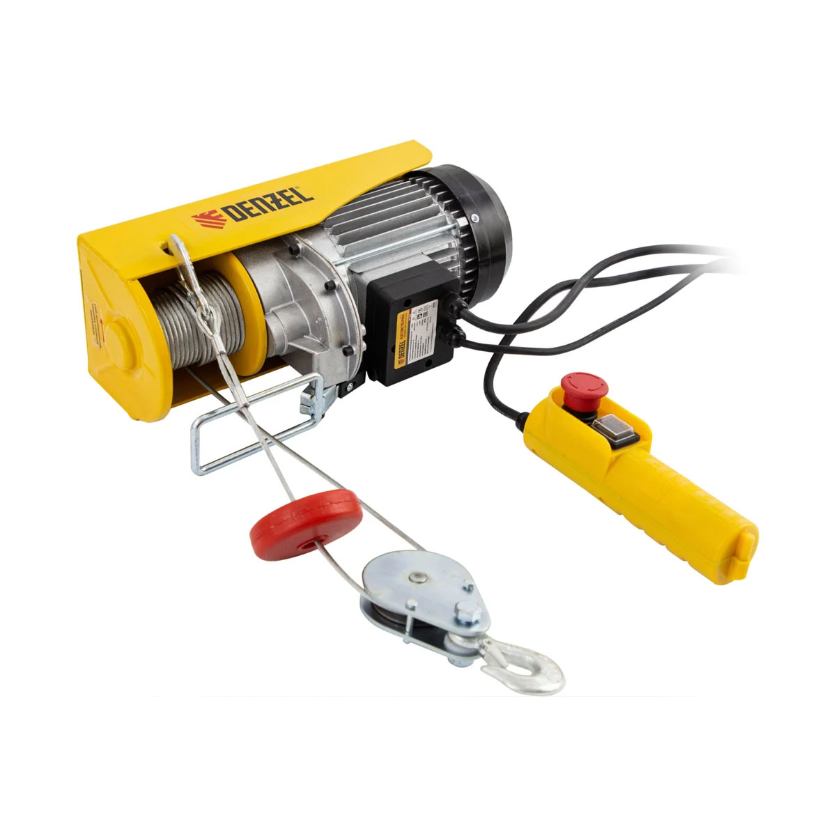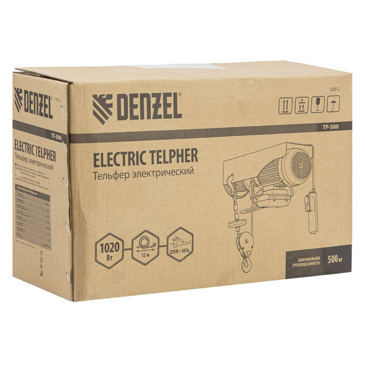 Электрический тельфер Denzel TF-500 мощностью 1020 Вт способен поднимать автомобильные двигатели, строительные материалы и другие грузы массой до 0,25 т напрямую и до 0,5 т с помощью блока полиспаста. Высота подъема составляет 6 м при использовании полиспаста и 12 м без него, скорость – 5 и 10 м/мин соответственно. Устройство пригодится в гараже, автомастерской или на строительной площадке. Полиспаст входит в комплект поставки.Преимущества:Долговечный двигатель – медная обмотка устойчива к перегреву и высоким нагрузкам, а специальные ребра и решетка обеспечивают эффективное охлаждение.Безопасность груза – встроенная система защиты не допускает самопроизвольного разматывания троса.Функция автоматической остановки – тельфер отключается при превышении допустимого веса груза или высоты подъема.Возможность экстренного торможения – кнопка аварийной остановки позволяет моментально прекратить работу при необходимости.Надежная фиксация груза – на крюке имеется предохранительная скоба.Продуманная конструкция – благодаря специальному навесу крюк всегда находится в вертикальном положении.Прочный трос – он изготовлен из стали, а его толщина составляет 4,2 мм.Удобная эксплуатация – управление осуществляется с выносного пульта.Быстрый монтаж – в комплект входит набор крепежей для установки тельфера.Характеристики:Мощность, кВт: 1Грузоподъемность, кг: 250Степень защиты: IP54Высота подъема, м: 6Диаметр троса, мм: 4,2Длина троса, м: 12Грузоподъемность с блоком полиспаст, кг: 500Высота подъема с блоком полиспаст, м: 12Напряжение, В: 220Вес, кг: 17,29Длина в упаковке, мм: 410Ширина в упаковке, мм: 150Высота в упаковке, мм: 250Комплектация: тельфер электрический - 1 шт, полиспаст - 1 шт, пульт ДУ - 1 шт, руководство по эксплуатации и гарантийный талон - 1 шт.