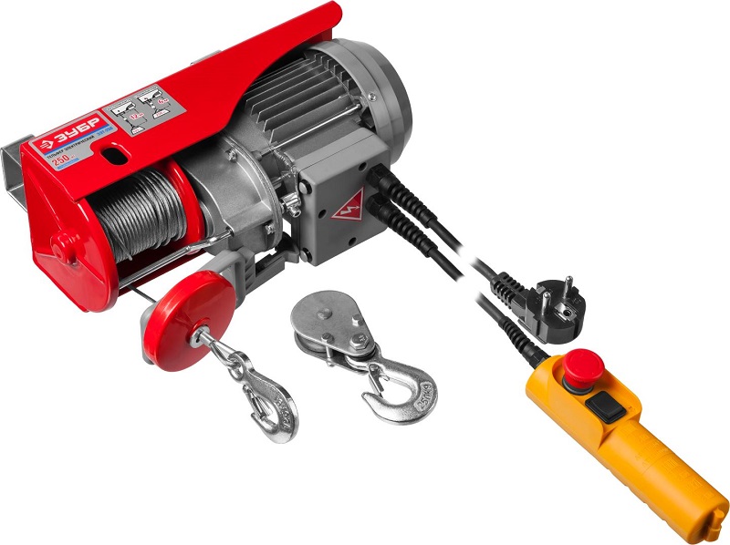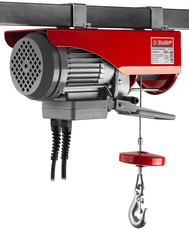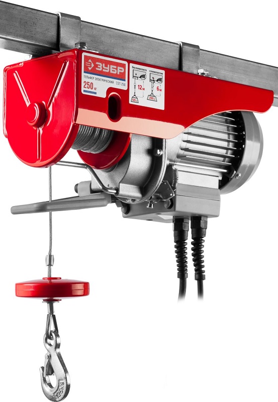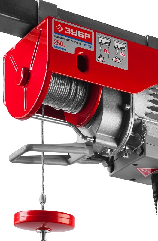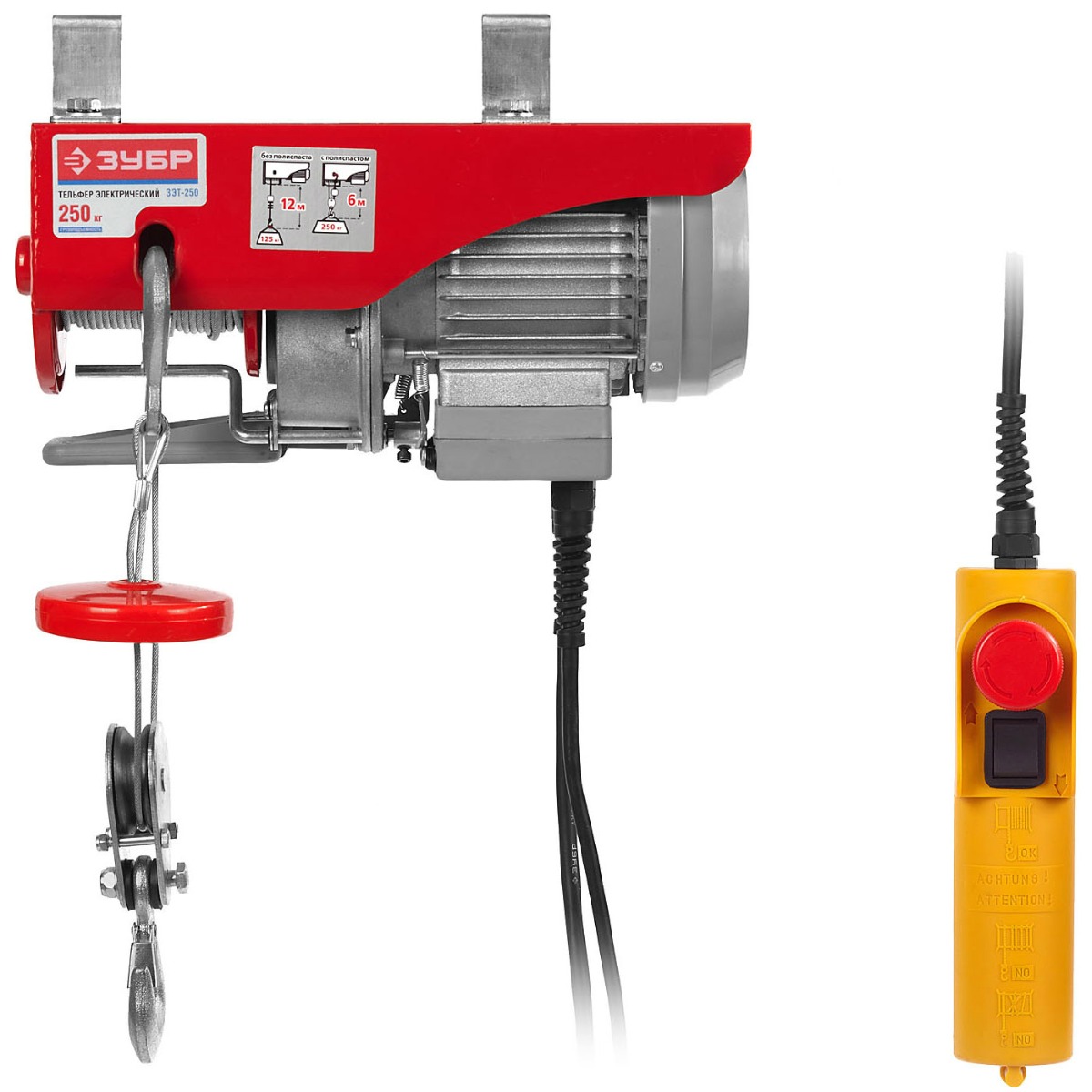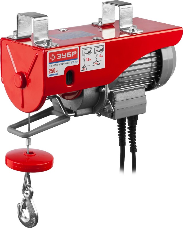 ельфер электрический (электротельфер) ЗУБР ЗЭТ-250, предназначен для подъема, опускания и перемещения (в пределах перемещения кран-балки) грузов в производственных помещениях, складах, гаражах и на строительных площадках. Увеличенная длина сетевого кабеля позволяет устанавливать тельфер на высоте до 4-х метров без необходимости наращивания проводов. Возможна работа в связке с полиспастом, благодаря чему подъемный вес увеличивается в два раза. Конструкция оснащена асинхронным двигателем, не требующим обслуживания в процессе эксплуатации. Надежная система защиты как оператора, так и самого изделия. Тельфер - устройство для простого и безопасного подъема различных грузов. Имея выносной пульт на длинном проводе и кнопку аварийной остановки, данное изделие будет незаменимо на складе, в гараже и стройплощадкеКомплектация:Тельфер - 1 шт.Крюк дополнительный - 1 шт.Блок полиспаста - 1 шт.Скоба крепления - 2 шт.Болт - 7 шт.Шайба - 7 шт.Гайка - 3 шт.Руководство по эксплуатации - 1 экз.Характеристики:Бренд - Зубр.Тип - Тельфер электрический.Напряжение - 220 В.Потребляемая мощность - 500 Вт.Диаметр троса - 3 мм.Макс. грузоподъемность без полиспаста - 125 кг.Макс. грузоподъемность с полиспастом - 250 кг.Длина троса - 12 м.