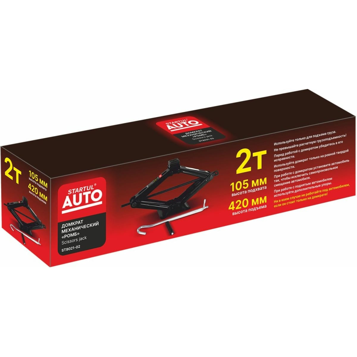 Ромбический домкрат STARTUL Auto 2 т ST8021-02 представляет собой грузоподъемный механизм, работающий на принципе шарнирного параллелограмма. Применяется для различных монтажно-демонтажных работ, поднятия автомобилей для замены колеса и мелких ремонтных работ. Отличается небольшим размером при внушительной высоте подъема. Благодаря своей мобильности и компактности, ромбические домкраты пользуются популярностью у автолюбителей.Технические характеристики домкрата STARTUL Auto ST8021-02Вид: ромбическийВысота подхвата: 105 ммВысота подъема: 420 ммРабочий ход: 315 ммГрузоподъемность: 2 тМатериал корпуса: стальРучка для переноски: нет