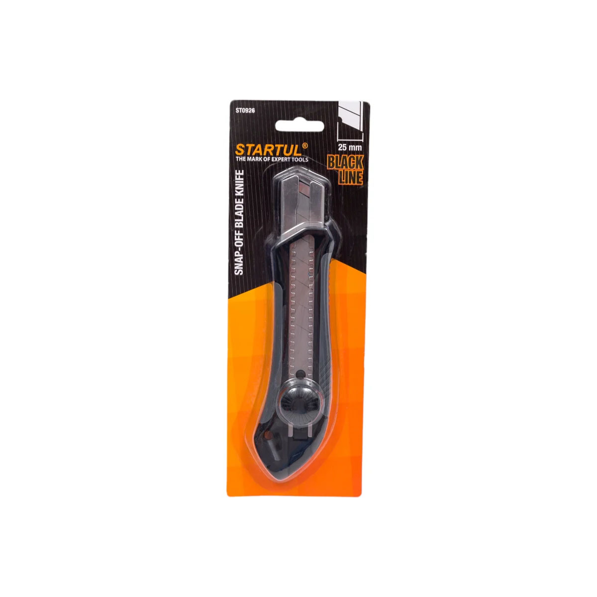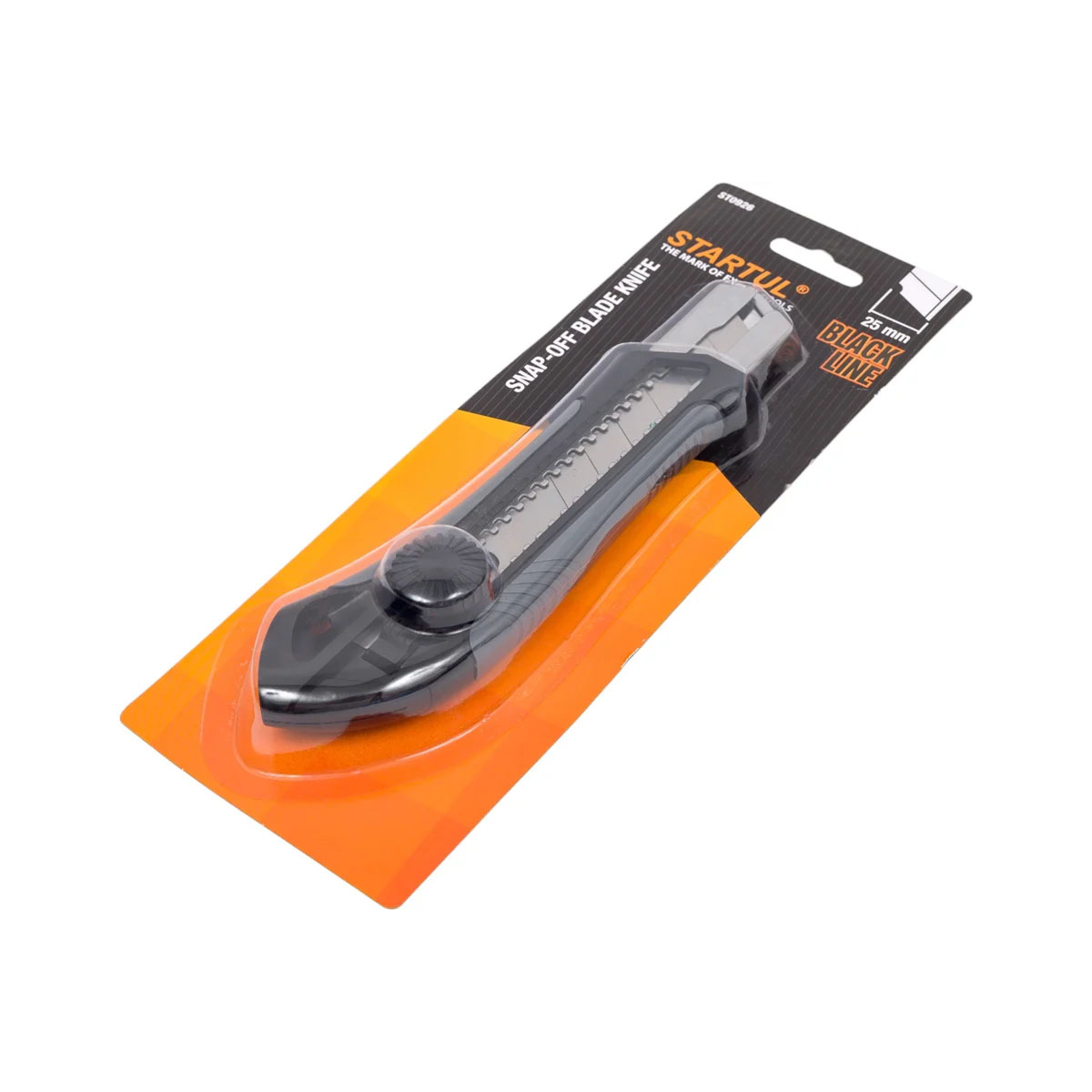 Нож STARTUL канцелярский ST0926 легко режет картон и бумагу. Подойдет для регулярной эксплуатации. Корпус имеет высокую прочность и жесткость. Инструмент легко настроить - быстро выдвигается лезвие, имеется стопор. При необходимости можно подобрать подходящую оснастку.Характеристики:Ширина лезвия: 25 ммВыдвижное лезвие: естьМатериал лезвия: стальМатериал рукояти: пластик