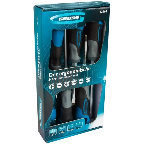 Отвертки торговой марки GROSS изготовлены из высококачественной инструментальной стали S2, имеют намагниченный наконечник. Предназначены отвертки для монтажа/демонтажа резьбовых соединений с типом шлица SL3.0, SL5.5 и SL6.5 (плоская отвертка) и PH0, PH1, PH2 (крестовые), максимальный крутящий момент затяжки составляет 1.0, 3.5, 8.2 и 1.0, 3.5, 8.2 Hm. Стержни закалены индукционными токами и покрыты хромовым защитным слоем. Эргономичные трехкомпонентные рукоятки изготовлены методом цельного литья, что придает прочность сцепления стержня и рукоятки. У основания рукояток имеется шестигранные выступы для работы с гаечным ключом на 10 мм. Упакованы отвертки в подвесную ламинированную коробку, удобную для размещения на стенде.Типы насадок в наборе: SL3,0 x 75 мм; SL5,5 x 100 мм; SL6,5 x 150 мм; Ph0 x 75 мм; Ph1 x 150 мм; Ph2 x 100 мм.Главная задача Gross заключается в создании инструмента, способного удивлять пользователей своей эффективностью, надежностью и эстетичностью. Качественные материалы, механизмы, облегчающие работу, эргономичный дизайн – все это гармонично сочетается в современном ручном инструменте GROSS.Качество GROSS напрямую зависит от сырья, которое подбирается с учетом особенностей использования инструмента. Обработка сырья и производство проходят на самом современном оборудовании. Перед окончательной сборкой проверяется качество каждой детали. Часть товара из каждой партии тестируется в условиях повышенных нагрузок. Только после успешного прохождения всех проверок инструмент GROSS поступает в продажу.