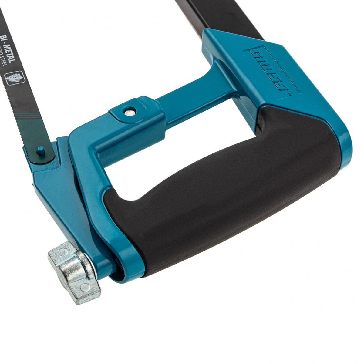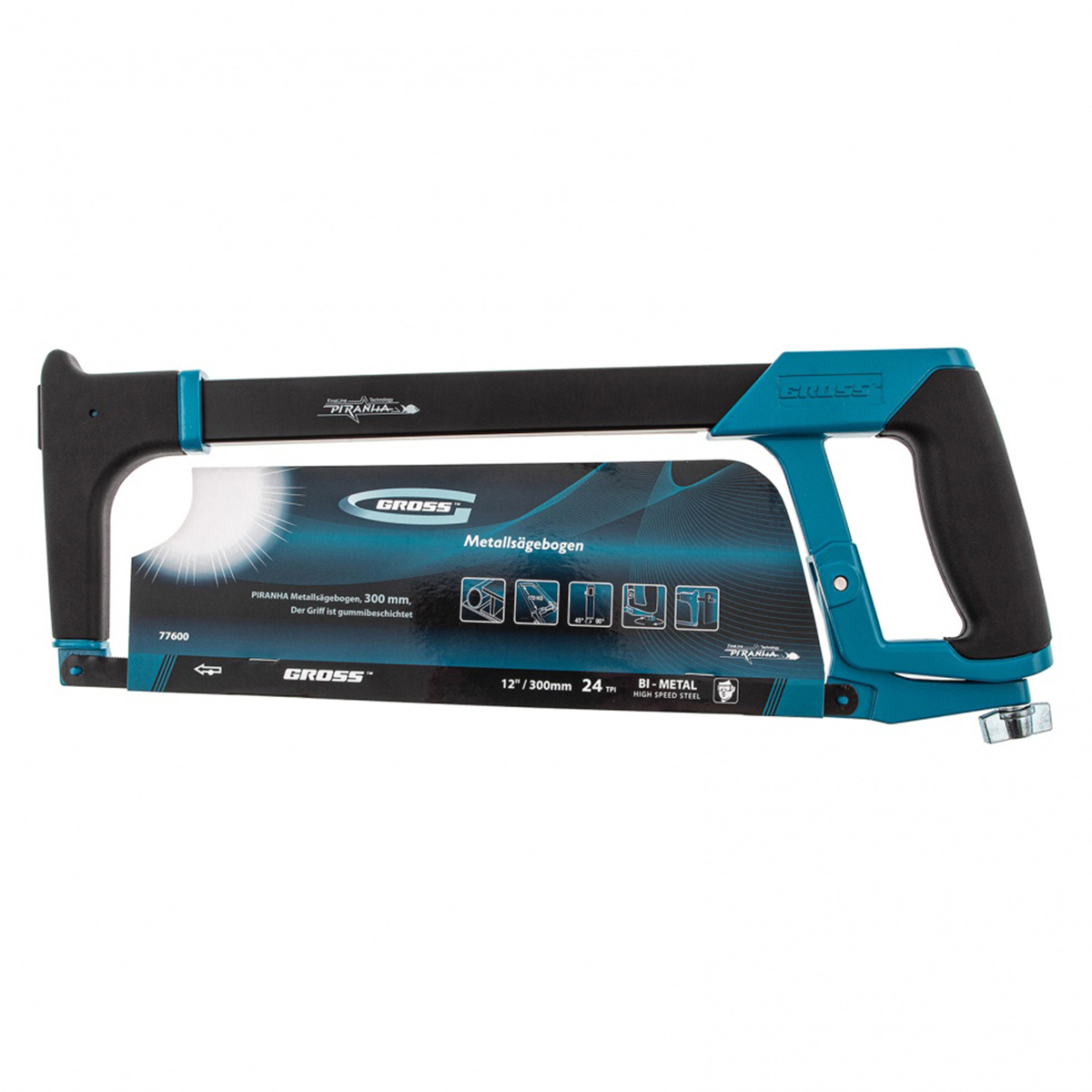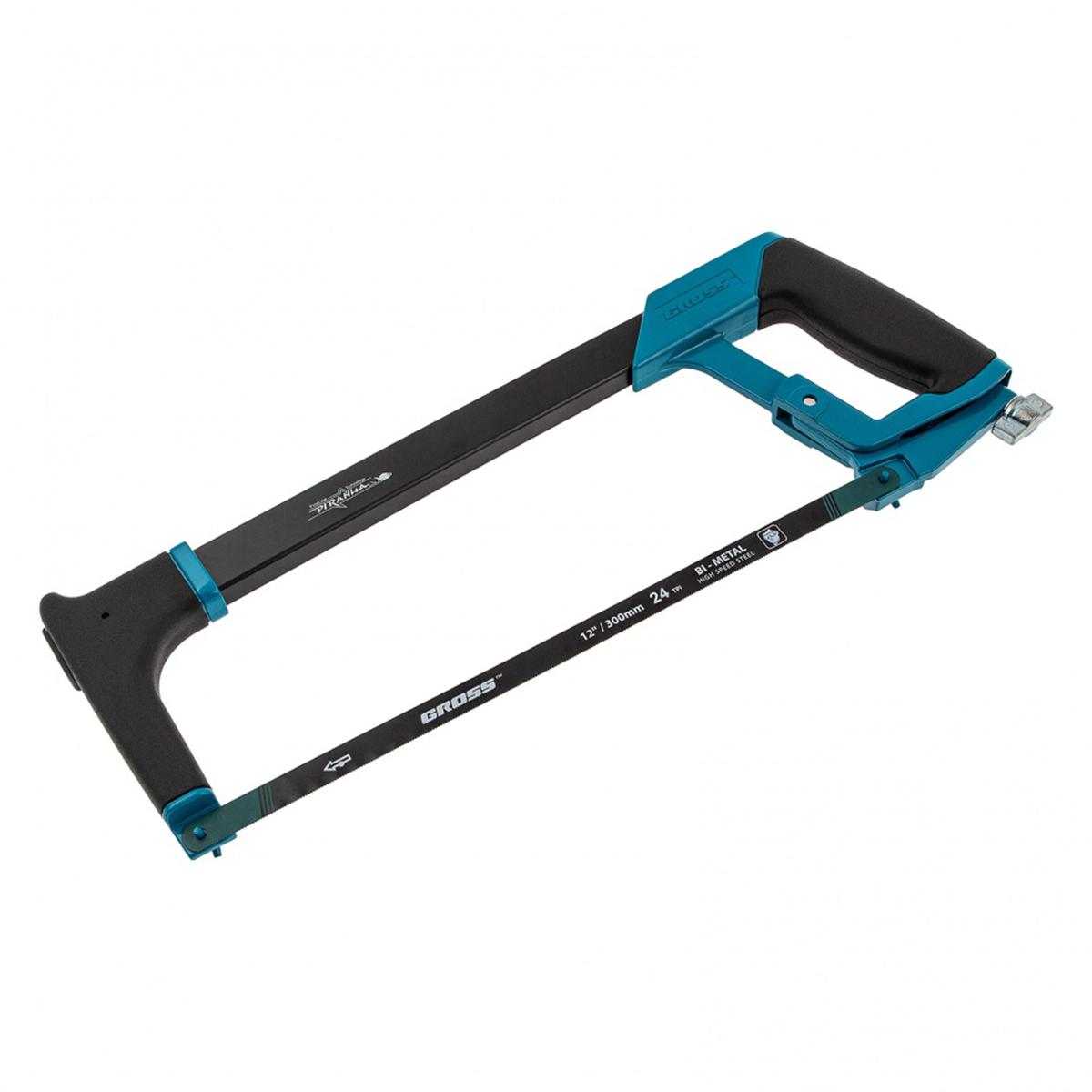 Ножовка Gross "PIRANHA" 77600 длиной 300 мм, с обрезиненной рукояткой и захватом, используется для работ по металлу. Рез получается точным и аккуратным за счет рычажно-винтового механизма, обеспечивающего оптимальную силу натяжения полотна. Конструкция рамки инструмента позволяет устанавливать полотна под углом 45 и 90 градусов, что расширяет спектр выполняемых работ.Преимущества:Долговечность – биметаллическое полотно с зубьями из быстрорежущей стали устойчиво к износу.Надежность – корпус ножовки изготовлен из прочного алюминиевого сплава.Высокое качество реза – шаг зуба полотна составляет 24 TPI, что позволяет быстро и точно распиливать заготовки даже из твердых металлов.Защита от коррозии – эмалевое покрытие предотвращает образование ржавчины при работе на открытом воздухе и в условиях повышенной влажности.Расширенный функционал – в раме имеется паз для установки лезвия, что дает возможность производить рез по типу ножа.Комфортная эксплуатация – прорезиненные рукоятка и захват обеспечивают надежный хват и уменьшают нагрузку на руку мастера.Характеристики:Длина лезвия: 300 ммУглы установки полотна: 45°, 90°Материал рамы: металлМатериал рукоятки: металл