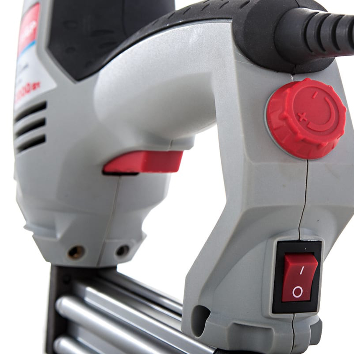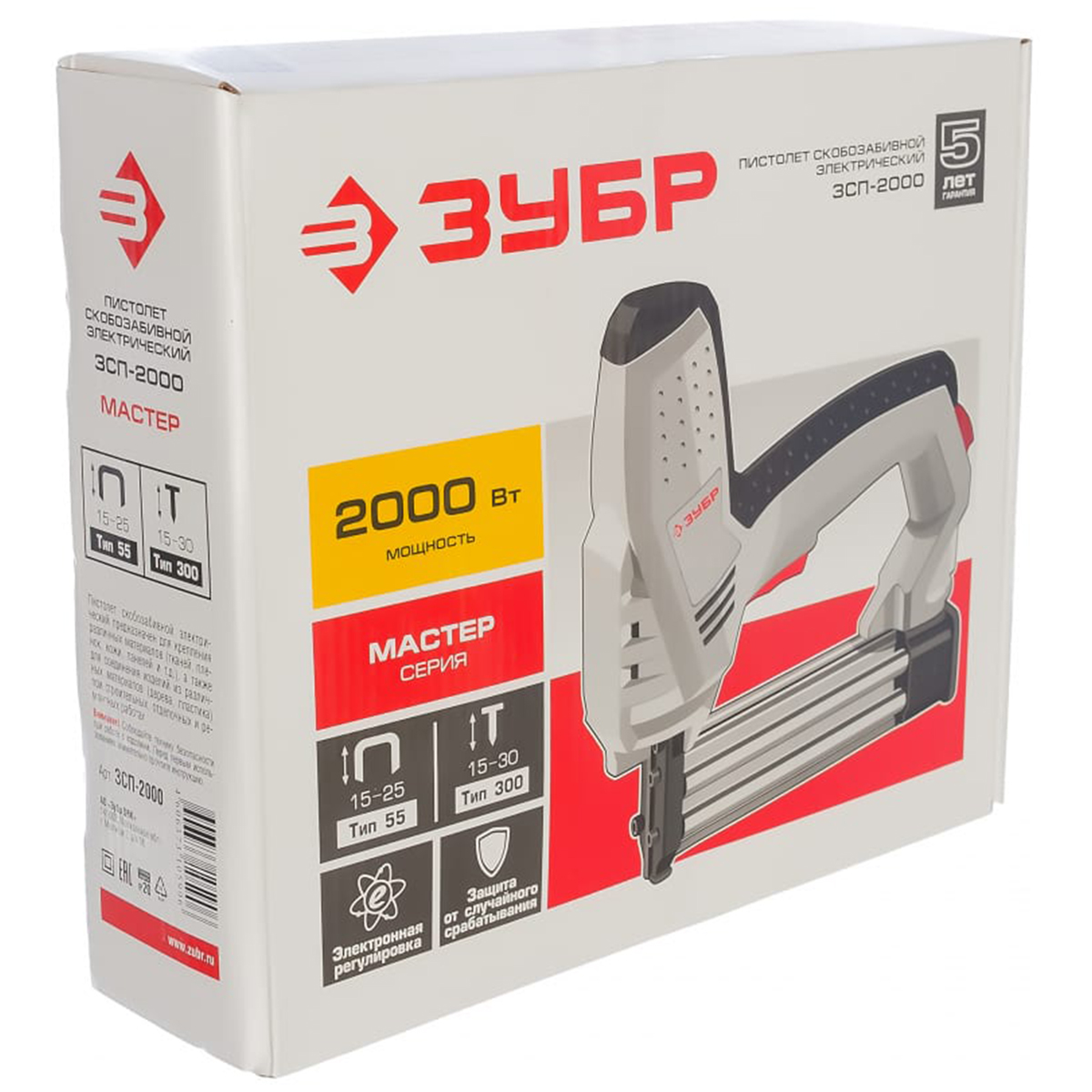 Скобозабивной пистолет ЗУБР ЗСП-2000 предназначен для крепления различных материалов: ткани, пленок, кожи, панелей, дерева, пластика и т.д. Конструкция модели позволяет использовать как скобы, так и гвозди. Имеется электронная регулировка силы удара, что позволяет оптимально настроить инструмент под работу с определенным материалом.Характеристики Подходящая расходка: скобы и гвозди (штифты)Тип скоб: 4/55/90/18GAТип гвоздей: 47/F/055/049/300/J/SK50Частота ударов, уд/мин: 20Регулировка силы удара: естьВозможность двойного удара: нетВес, кг: 1,6Мощность, Вт: 2000Размер скоб, мм: 15-25Длина гвоздей, мм: 15-30Вместимость магазина (гвозди), шт: 50Вместимость магазина (скобы), шт: 50