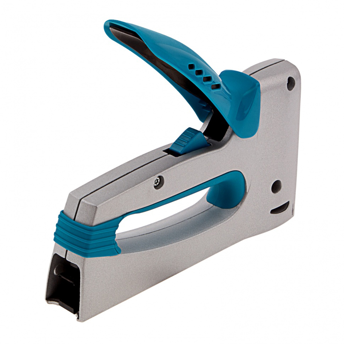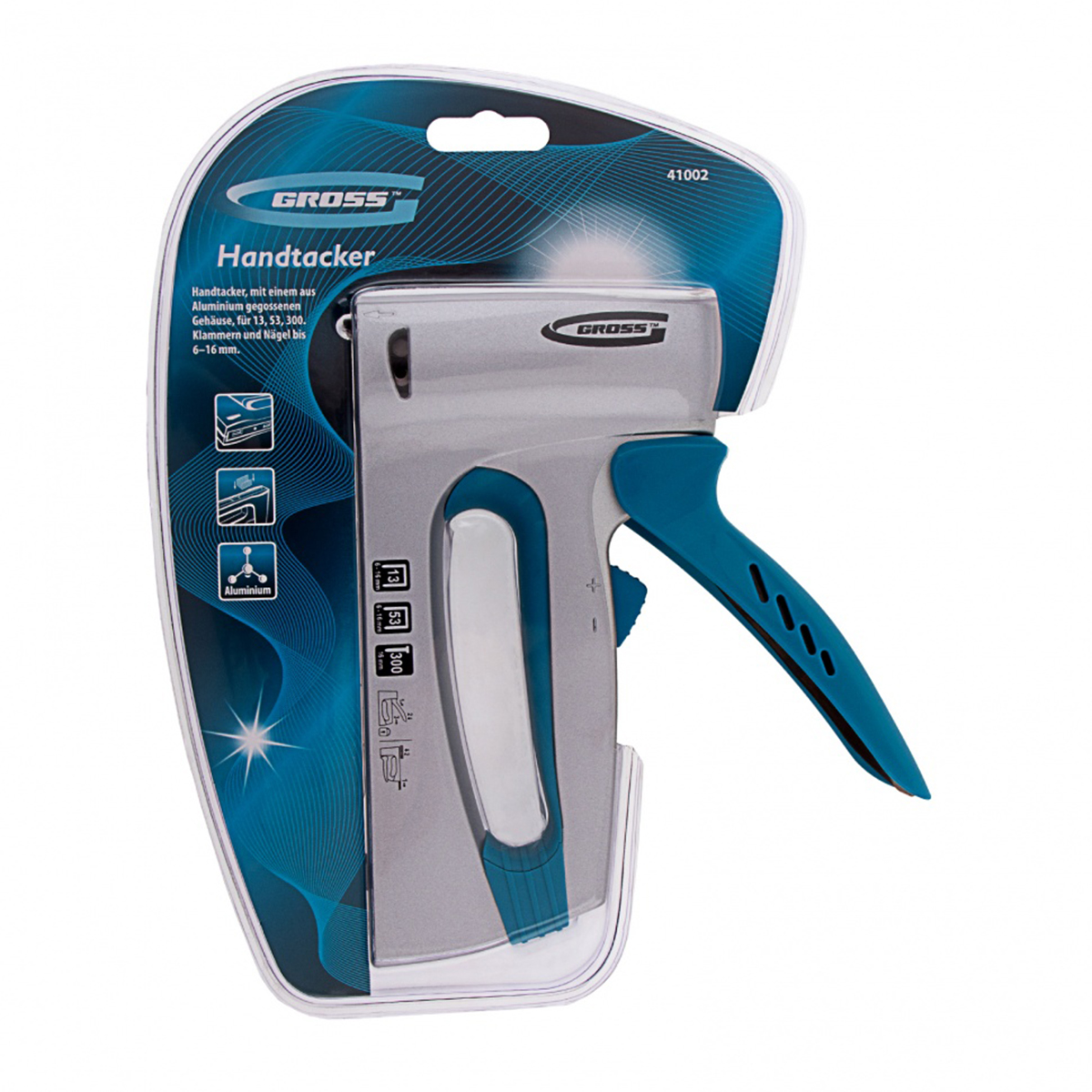 Мебельный степлер Gross 41002 в алюминиевом корпусе, с функцией регулировки силы удара, совместим со скобами типа 13 и 53 размером 6-16 мм и гвоздями типа 300 размером 16 мм. Инструмент используют для фиксации на деревянном основании оргалита, фанеры, ДВП, ДСП, пленки, утеплителя и других листовых материалов. Инструмент будет полезен при сборке и обшивке мебели, укладке ковровых покрытий и изоляционных материалов, выполнении багетных работ. Подходит для профессионального применения.Преимущества:Удобная эксплуатация – двухпозиционный переключатель, регулирующий силу удара, облегчает работу с длинными скобами и твердыми материалами.Длинный тонкий носик – работать удобно даже в ограниченном пространстве.Сбалансированная конструкция – при использовании степлера не возникает отдачи.Прочность – корпус устойчив к повреждениям, т.к. изготовлен методом литья из алюминиевого сплава.Быстрая загрузка скоб – для подготовки инструмента к работе и удаления заклинивших крепежей не требуется много времени.Безопасность – рукоятка легко фиксируется в горизонтальном положении, предотвращая случайное срабатывание механизма.Легкий контроль количества крепежей – с помощью специального окошка можно видеть, сколько скоб осталось, и вовремя загружать их.Комфорт во время работы – эргономичная рукоятка обеспечивает оптимальное положение кисти руки, что снижает усталость при длительном использовании степлера.Удобное хранение и транспортировка – инструмент с зафиксированной рукояткой не занимает много места.Информативная упаковка – степлер поставляется в двойном блистере, позволяющем осмотреть его перед покупкой, а пиктограммы содержат необходимую техническую информацию.Надежность и высокое качество – инструмент изготовлен в Тайване на высокотехнологичном оборудовании.Характеристики:Материал корпуса: алюминийМатериал рукоятки: стальКоличество компонентов в рукоятке: эргономичная, пластиковая накладкаТип скоб: 13, 53Размер скоб: 6-16 ммРегулировка силы удара: двухпозиционнаяОсобенности: быстрая загрузка скобоприемника, ударный механизм рессорного типаПодходящие расходники: скобы, гвозди