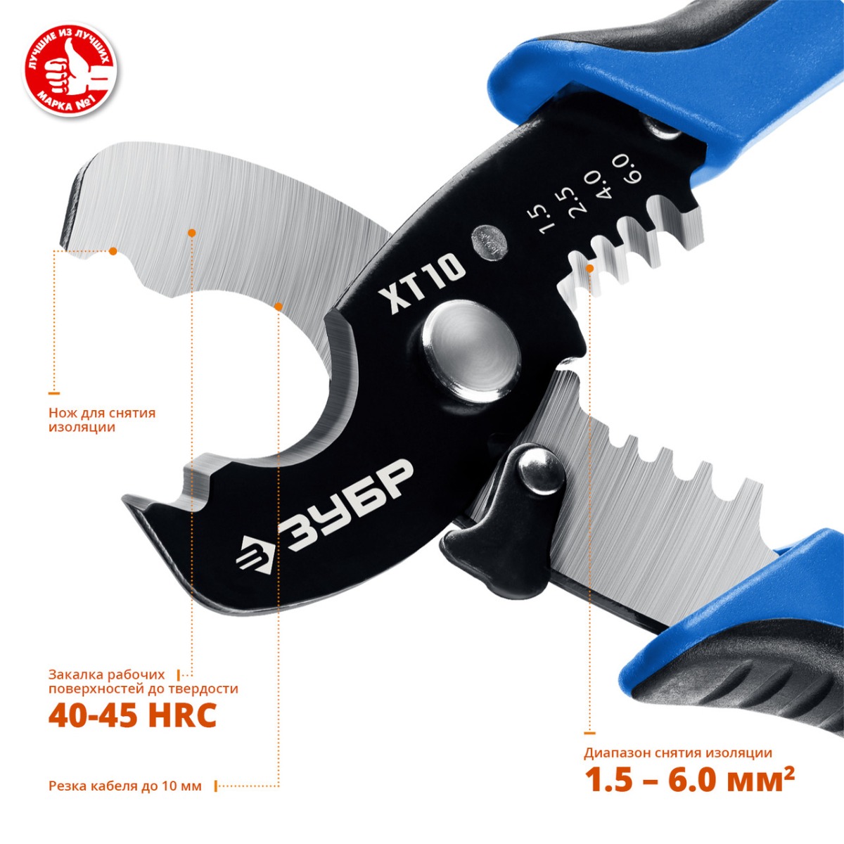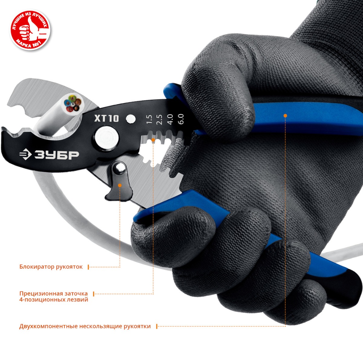 Кабелерез многофункциональный ЗУБР изготовлен из высококачественной стали, предназначен для профессионального применения. Обладает повышенным ресурсом, обеспечивает высокое качество электромонтажных работ.Применение:Применяется для удаления изоляции и обрезки кабеля. Не прикладывайте ударных нагрузок. Не использовать для работы под напряжением. Не предназначены для резки стальной проволоки и холоднотянутых медных проводов