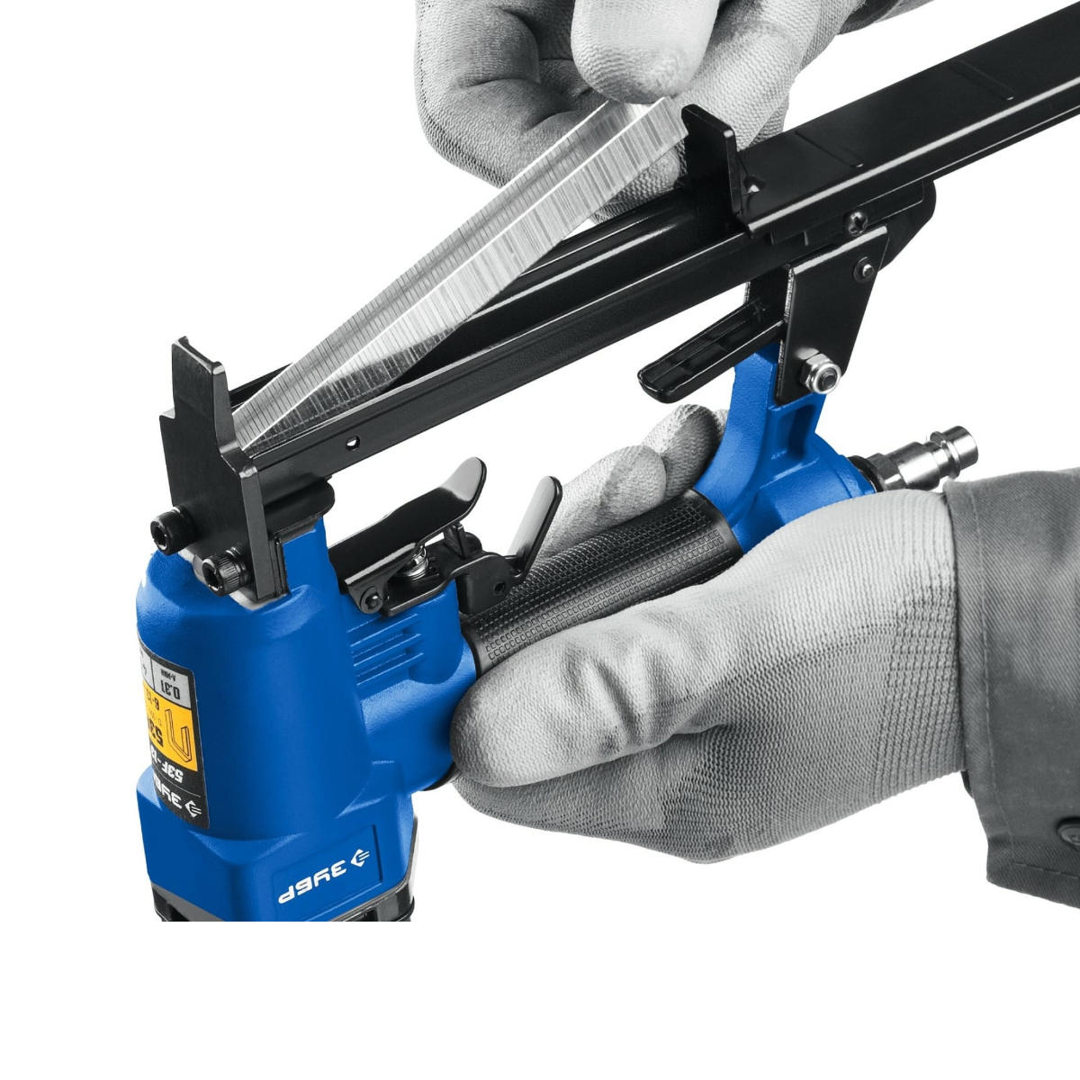Пневматический степлер для скоб представляет собой профессиональный пневматический скобозабиватель, произведенный из высококачественных материалов. Позволяет быстро и эффективно выполнить свою работу. Предусмотрена обрезиненная рукоятка для удобства хвата.ПреимуществаЛитой алюминиевый корпусОбрезиненная рукоятка для удобства хватаПростота в использованииБольшой магазин на 100 скобУстойчив к перегреву, пожаробезопасенНизкое потребление воздуха на ударХарактеристики:Подходящая расходка: скобыТип скоб: 53F/D/56/73/20GAДиаметр воздушного штуцера, дюйм: 1/4MТип соединения: рапид (EURO)Вес: 1.25 кгРазмер скоб, мм: 6 - 13Количество скоб в магазине, шт.: 100Средний расход воздуха, л/мин: 0,31
