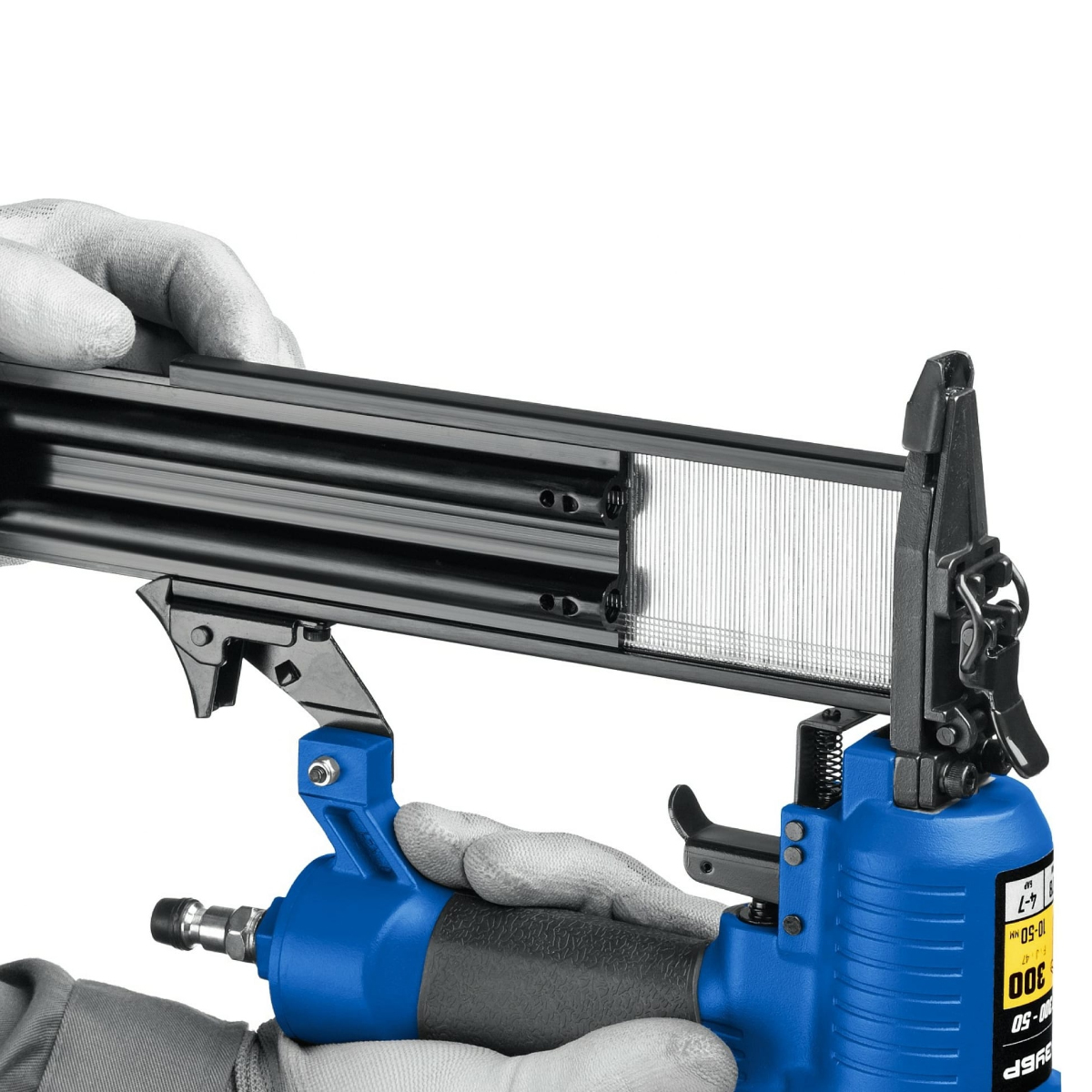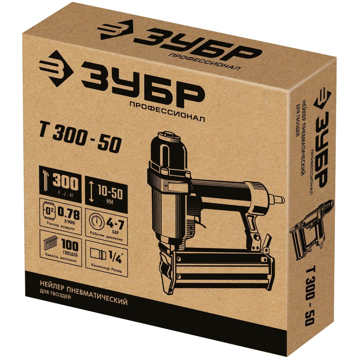 Нейлер (гвоздезабиватель) пневматический для гвоздей ЗУБР Т300-50 31933, предназначен для работ по устройству паркетных полов, ремонту балконов и террас, работе с мебелью.Низкое потребление воздуха на ударХарактеристики:Давление: 4,2 - 6,9 АтмТип гвоздей: 300Длина гвоздей: 10-50 ммРасходные материалы: гвозди (штифты)Диаметр воздушного штуцера: 1/4 дюймРасход воздуха на удар: 0,78 л/минНейлер устойчив к перегреву, пожаробезопасенКомплектация:Пневматический нейлер - 1 шт.Имбусовые ключи - 2 шт.