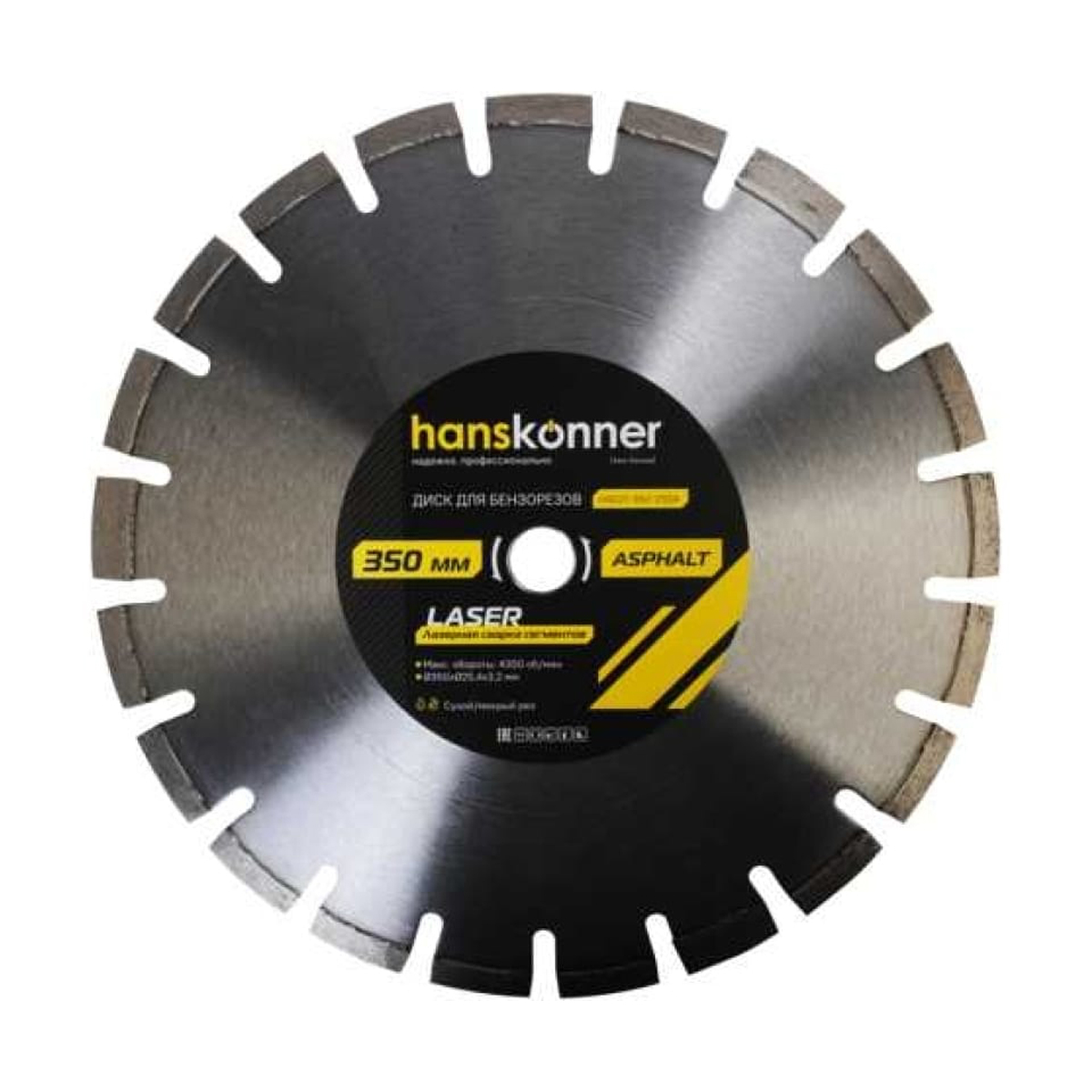 Диск алмазный Hanskonner H9021-350-25SA предназначен для моделей бензорезов Hanskonner HCG7435C и Sturm! CG5835.ПреимуществаЛазерная сварка сегментов для надежной работы с твердыми материаламиВысокое содержание алмазов и высота режущей кромки 10 мм увеличивают износостойкость и срок эксплуатации дискаКорпус диска из прочной легированной стали гарантирует стабильную работу в условиях повышенной нагрузки и высокой температурУвеличенные пазы сегмента защищают тело диска от перегреваТехнические характеристики :Диаметр: 350 ммТип диска: алмазныйВид диска: сегментированныйПосадочный диаметр: 25.4 ммТип: по асфальту/бетонуСегментированный: даКоличество сегментов: 21Тип реза: сухой (с СОЖ и без)Высота алмазного слоя: 10 ммКоличество в упаковке: 1 штТип: по асфальту, бетону, кирпичу