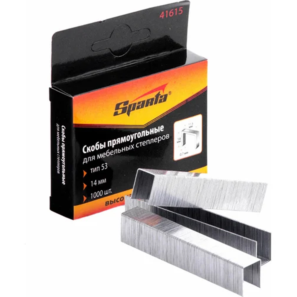 Скобы для мебельного степлера SPARTA тип 53 14мм 1000шт. 41615 - заправляются в мебельные степлеры. Подходят для закрепления древесины, фанеры, ДСП, оргалита, картона, и других материалов. Пригодятся для проведения ремонтных и облицовочных работ, а также обивки мебели.Преимущества :Стальные скобы обладают необходимыми прочностными характеристикамиОцинкованные изделия устойчивы к образованию коррозииВ упаковке 1000 расходников, которых хватит на длительное времяКомплектация :Скобы для мебельного степлера 1000 шт.Упаковка 1 шт.Характеристики :Бренд: SPARTAВес: 0.104 кгДлина: 14 ммКоличество: 1000 шт.Материал: стальНазначение: ткань/картон/тонкие деревянные планкиНожка: стандартнаяТип (классификация производителя): 53Тип скоб: 53/AТолщина: 0.7 ммФорма: прямоугольныеШирина: 11.3 мм