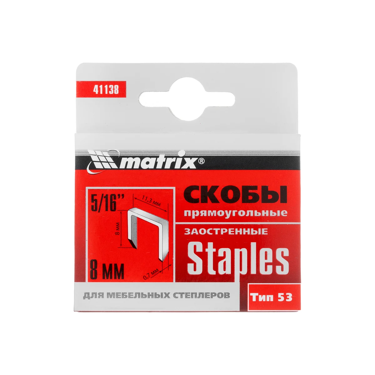 Заостренные скобы Matrix 41138 для мебельного степлера, тип 53, размером 8 х 11,3 х 1 мм, 1000 шт. в коробке, помогут обить мебель, зафиксировать утеплитель, а также выполнить другие отделочные и ремонтные работы. Скобы крепко соединяют различные материалы: древесину, фанеру, картон, ДСП.Технические характеристики скоб MATRIX 8 мм; тип 53, 1000шт.Фасовка: 1000 штВес нетто: 0.065 кгДлина: 8 ммТип (классификация производителя): 53Тип скоб : 53/AФорма: тонкаяШирина: 11.2-11.4 (7/16 дюйма) ммНожка : D-образнаяТолщина: 0.7-0.75 ммНазначение: ткань/картон/тонкие деревянные планки