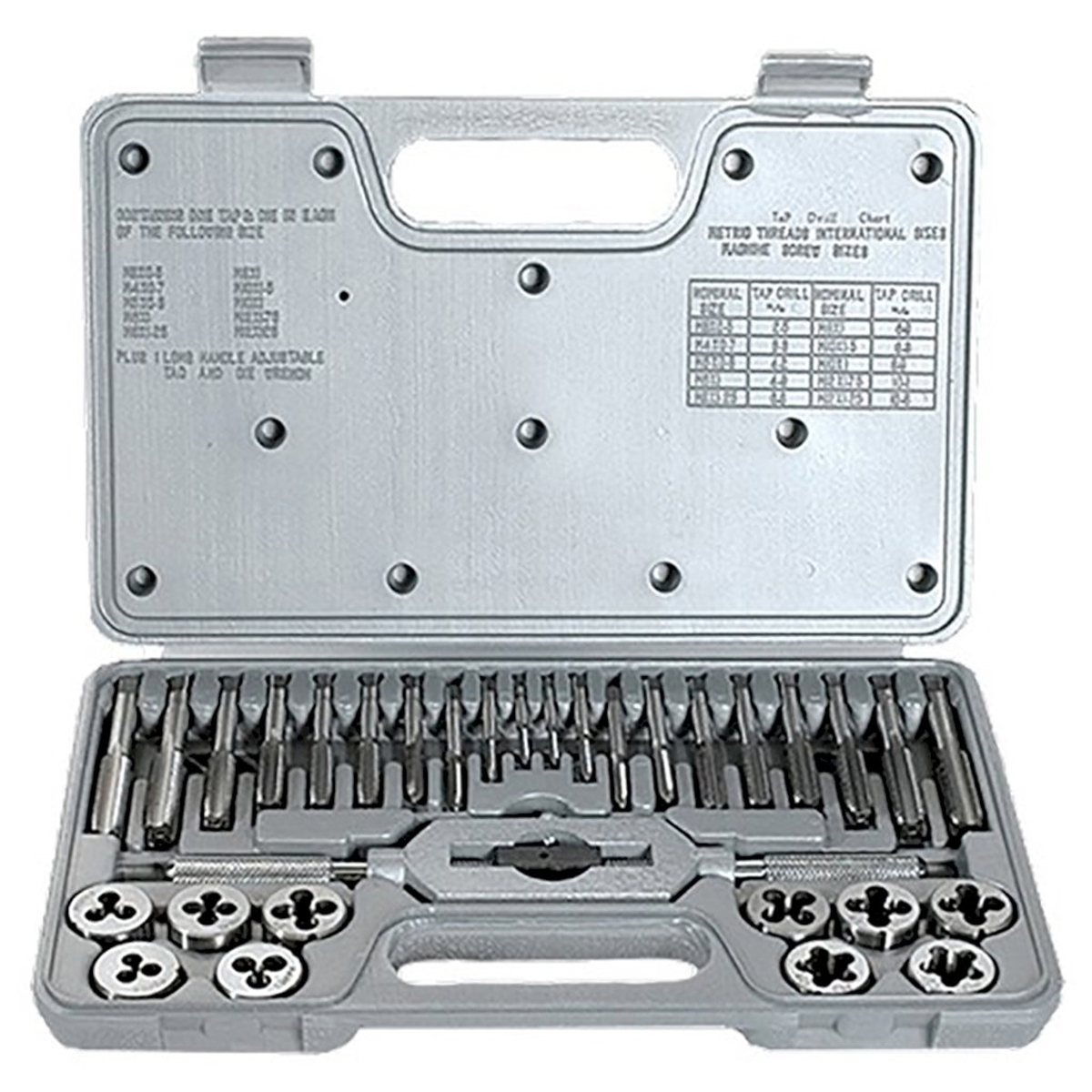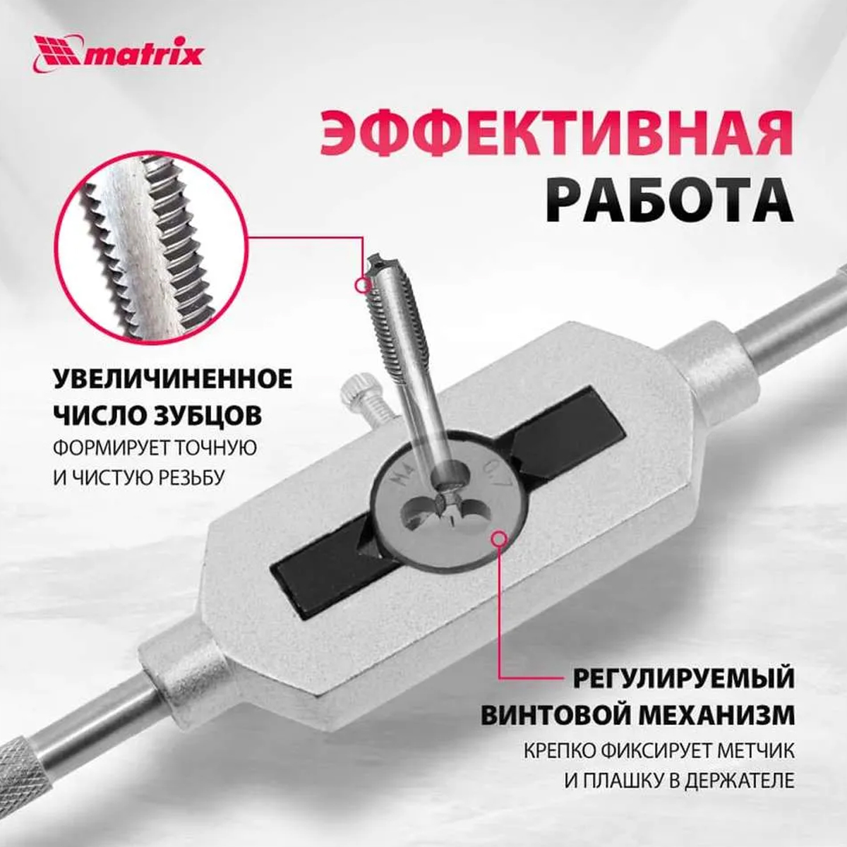 Набор метчиков и плашек MATRIX М3-М12 31шт. 77337 - позволяет нарезать наружную и внутреннюю резьбу на металлических деталях. Также он применяется для восстановления сорванной резьбы. Все инструменты хранятся в удобном пластиковом боксе. Набор предназначен для ремонтных работ, используется в профессиональной и бытовой сфере.Преимущества :Прочность – плашки и метчики изготовлены из высокоуглеродистой легированной стали 9ХСДолговечность – твердость режущих частей составляет 59-62 HRC, поэтому они долго сохраняют рабочие свойстваВысокое качество внутренней резьбы – в комплекте имеются метчики первого и второго номеров для первичного прохода и финишной доводкиЭффективность – комбинированный плашко- и метчикодержатель надежно удерживает режущий инструмент во время работы со значительным усилиемТочная внешняя резьба – число зубцов на калибрующей части плашек увеличеноБыстрый поиск нужного предмета – каждый инструмент имеет маркировку с указанием размера и шага резьбыКомплектация :Метчики: М3 x 0.5 мм, М4 x 0.7 мм, М5 x 0.8 мм, М6 x 1 мм, М8 x 1 мм, М8 x 1.25 мм, М10 x 1 мм, М10 x 1.5 мм, М12 x 1.25 мм, М12 x 1.75 ммПлашки: М3 x 0.5 мм, М4 x 0.7 мм, М5 x 0.8 мм, М6 x 1 мм, М8 x 1 мм, М8 x 1.25 мм, М10 x 1 мм, М10 x 1.5 мм, М12 x 1.25 мм, М12 x 1.75 мм - по 2 шт каждого размераВороток для метчиков: М3-М12Пластиковый кейсХарактеристики :Бренд: MATRIXВес брутто: 1.3 кгГабариты в упаковке (ДxШxВ): 290 х 183 х 41 ммКоличество в наборе: 31 шт.Материал: стальНаправление резьбы: праваяТип: метчики; плашкиМин. резьба: M3Макс. резьба: M12