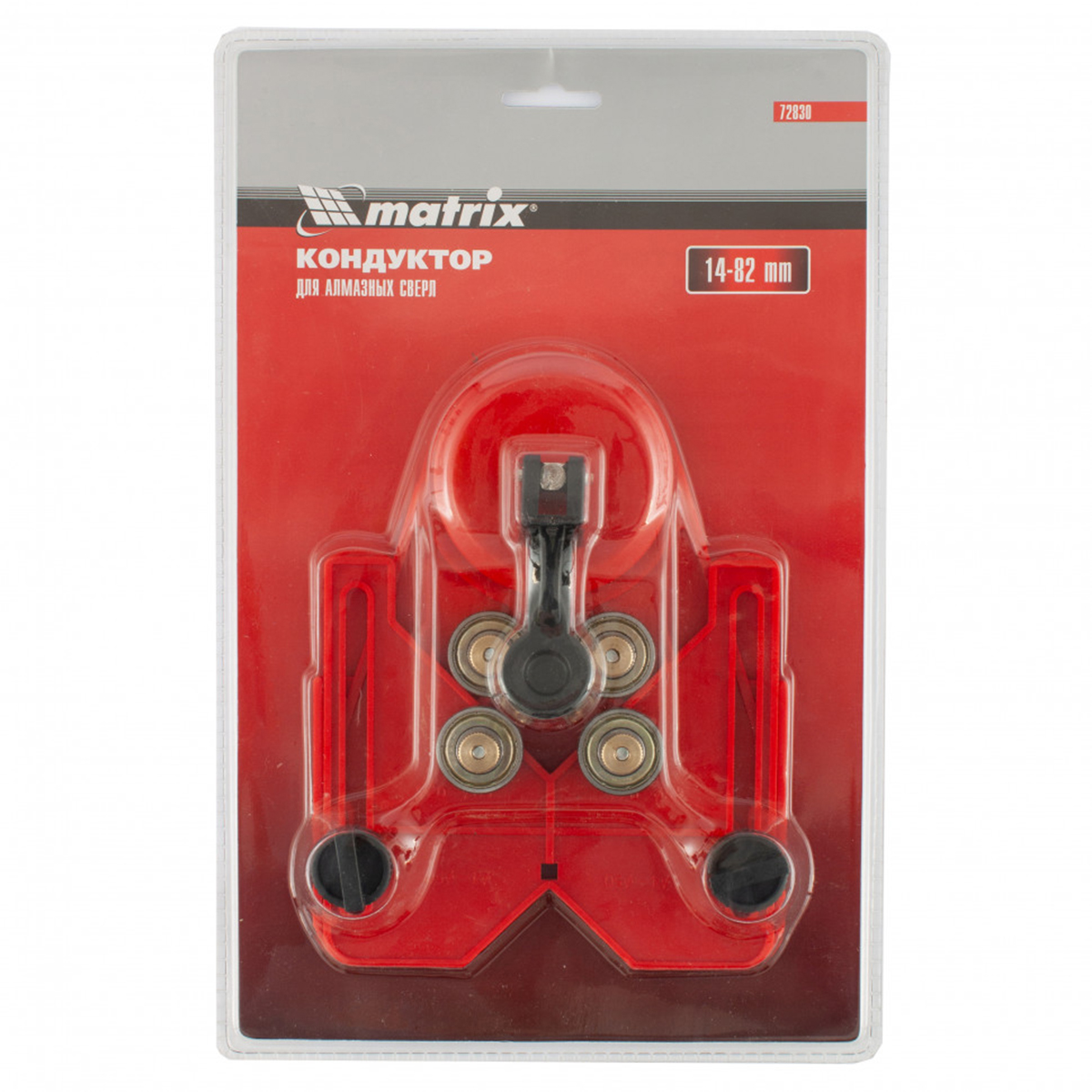 Кондуктор для алмазных сверл Matrix 72830 позволяет точно позиционировать алмазные сверла и коронки размером 14-82 мм. Препятствует сдвигу оснастки и облегчает процесс засверливания. Приспособление используется для работ по керамической плитке, граниту, керамограниту, стеклу и мрамору.Преимущества:Корпус изготовлен из легкого и прочного ABS-пластика, что обеспечивает его износостойкость и долговечность.Кондуктор снабжен вакуумной присоской, при помощи которой быстро и надежно крепится к поверхности.4 подшипника делают позиционирование сверла (коронки) максимально точным.К штуцеру на корпусе можно подвести патрубок водяного охлаждения, что позволяет многократно увеличить ресурс как самого кондуктора, так и сверла.Простой механизм фиксации позволяет за несколько секунд установить оснастку в нужное положение, экономя время мастера.Характеристики:Материал корпуса: ABS-пластикДиаметр сверления: 14-82ммМатериал ваккумной присоски: резинаДиаметр приемного штуцера: 6 ммМеханизм подачи воды: штуцер