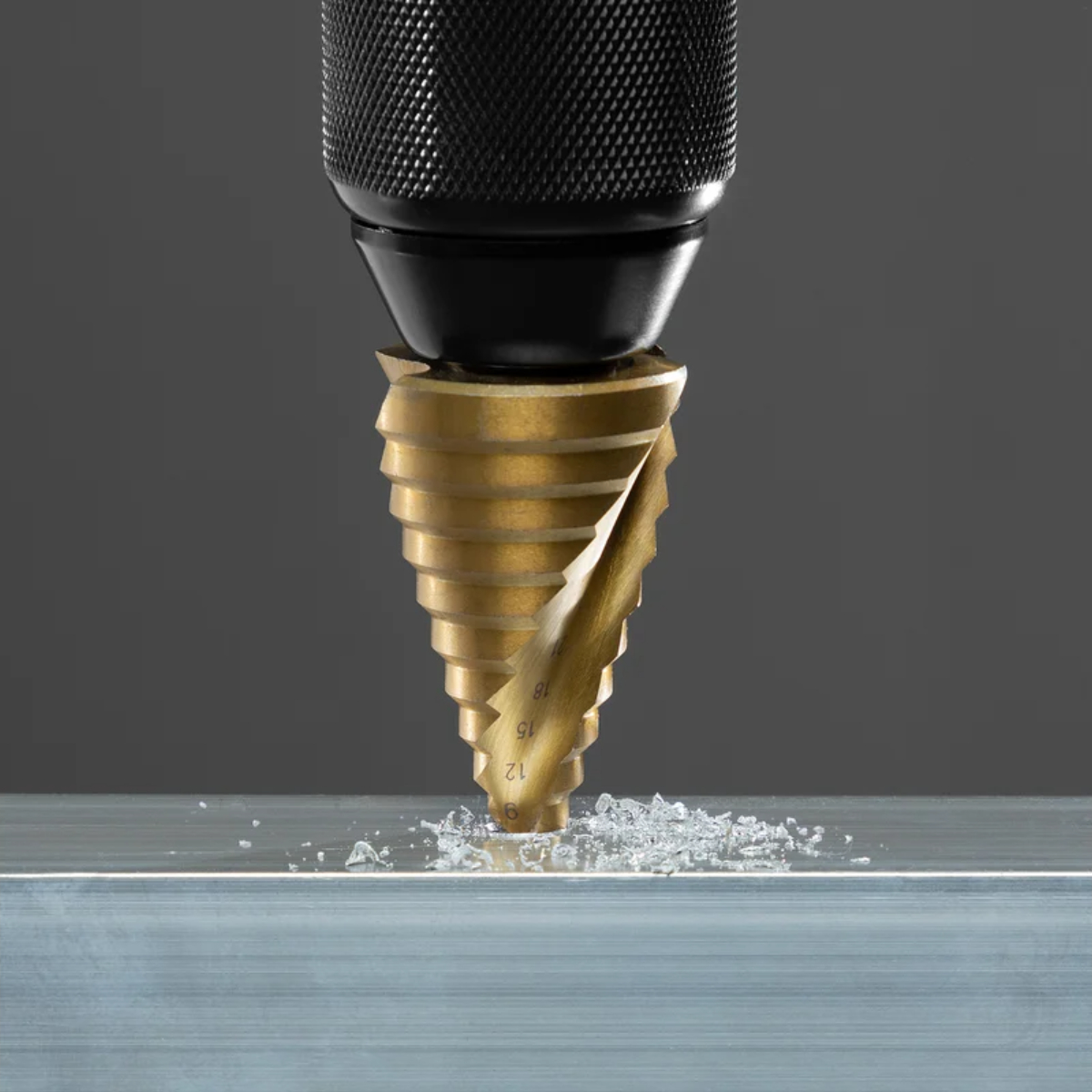 Ступенчатые cверла предназначены для сверления отверстий разных диаметров в листовых и тонкостенных (до 4 мм) изделиях из стали, цветных металлов, нержавеющей стали и пластика. Каждый следующий размер имеет плавный переход в виде ступеньки, что позволяет получать аккуратное отверстие нужного диаметра.Диаметр: 9 мм, 12 мм, 15 мм, 18 мм, 21 мм, 24 мм, 27 мм, 30 мм, 33 мм, 36 ммМатериал: HSS