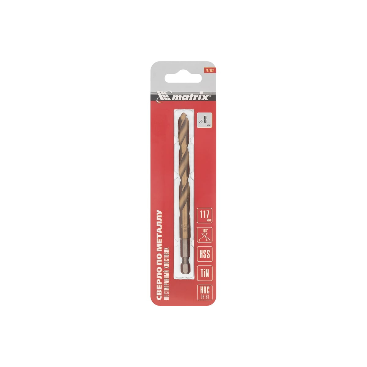 Сверло по металлу изготовлено из инструментальной легированной стали. Поверхность сделана из титаносодержащего сплава, что значительно повышает эксплуатационные характеристики сверл по металлу. Покрытие из нитрида титана увеличивает стойкость инструмента в 2–2,5 раза. Шестигранный хвостовик предотвращает поворот в патроне.Характеристики:Тип: сверлоНазначение: по металлуТип обработки поверхности: нитридтитановоеТип хвостовика: шестигранныйДиаметр: 8 ммДиаметр хвостовика: 6 ммДлина: 117 ммРабочая длина: 75 ммЗаточка: 118 градусов
