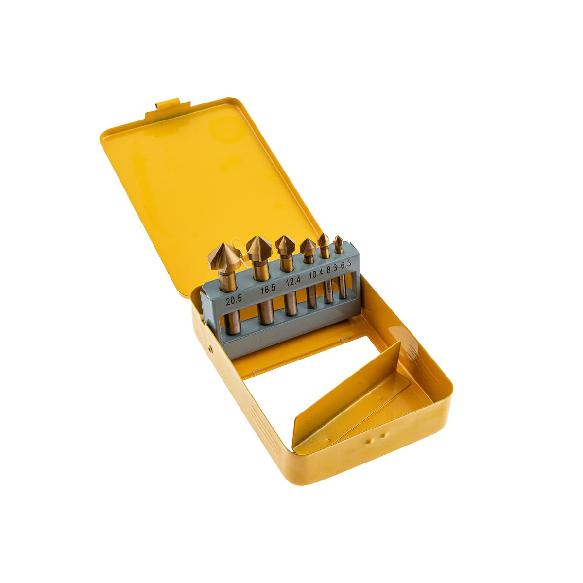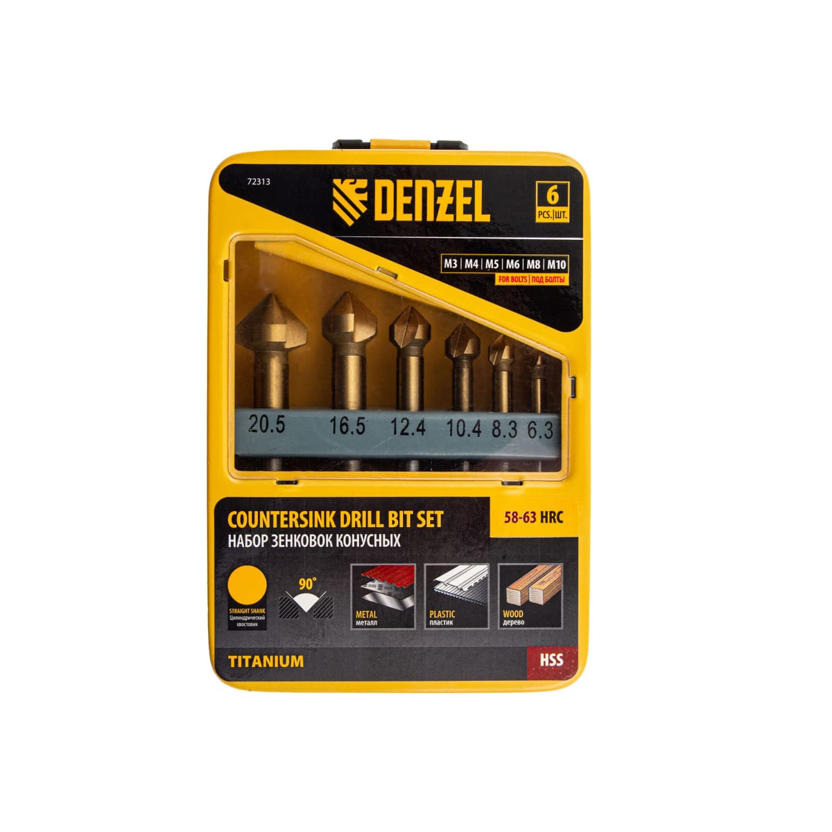 Набор зенковок M3-M10 Denzel 72313, 6 шт. из стали HSS, в комплекте с металлическом кейсом, применяется при работе с электрическими дрелями и сверлильными станками. Зенковки используются для выполнения конических отверстий и снятия фасок в стали, цветных металлах, пластике и древесинеТехнические характеристики:Тип хвостовика: цилиндрическийКоличество в упаковке: 6 штКонусный: естьУгол проточки: 90 градМатериал обработки: дерево/металлМатериал зенкера: HSSОграничитель: нет
