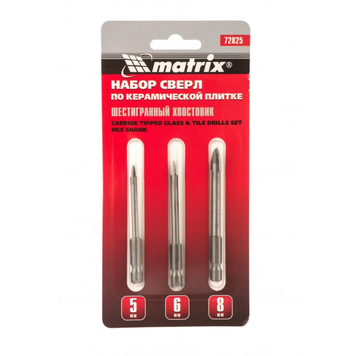 Набор сверл MATRIX 72825 предлагает оснастку, оптимизированную для сверления керамики, стекла и кафельной плитки при выполнении ремонтных и монтажных работ. В комплекте представлены 3 насадки с диаметром стреловидных рабочих частей 5, 6 и 8 мм, рассчитанные на использование только в безударном режиме электродрели. Благодаря специальной заточке сверла уверенно проделывают сквозные отверстия в кафеле и стекле, не повреждая хрупкий материал. Каждое изделие получило шестигранный хвостовик, необходимый для монтажа в ключевой или быстрозажимной патрон электроинструмента.Металлические части сверл из комплекта MATRIX 72825 выполняются из инструментальной легированной стали. Насадки отличаются внушительным сроком службы и являются востребованными как при выполнении работ на бытовом уровне, так и при профессиональном применении. Упаковкой для них послужил прозрачный блистер.Преимущества:Водяное охлаждение в процессе сверления значительно повышает ресурс сверла.Пластина из сплава YG6X облегчает процесс засверливания и гарантирует долговечность оснастки.Коррозионностойкое покрытие не допускает появления ржавчины на сверле.За счет 6-гранного хвостовика оснастка не прокручивается в патроне.Характеристики:Тип хвостовика: шестигранныйМатериал обработки: керамическая плитка