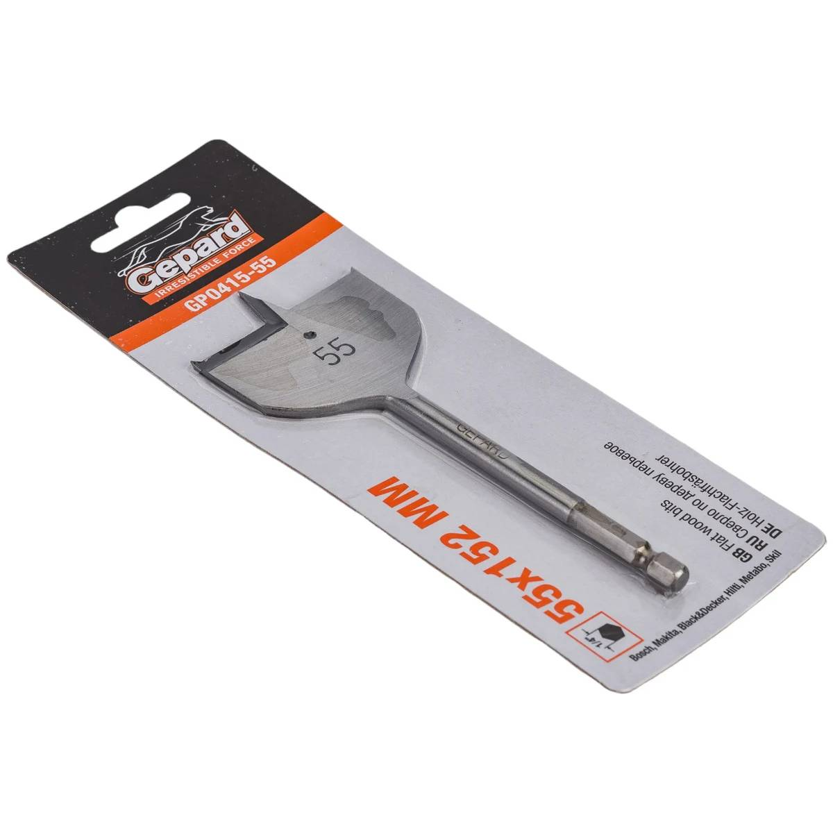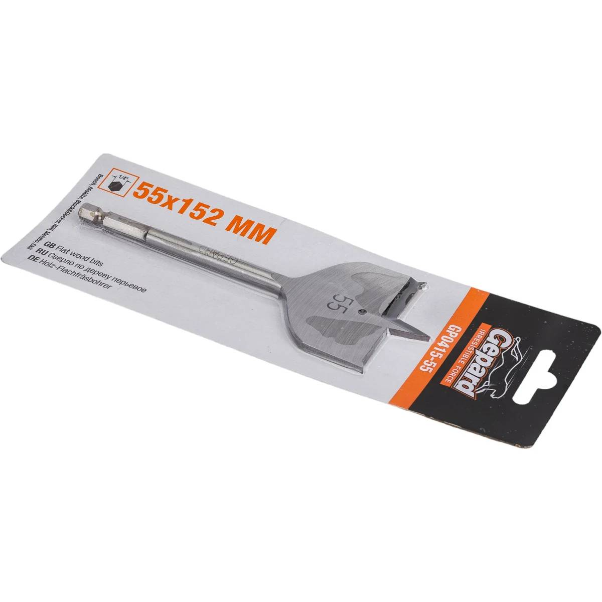 Сверло по дереву перьевое изготовлено из высококачественной углеродистой инструментальной стали для сверления глухих и сквозных отверстий в мягкой и средней твердости древесине и легких строительных материалах, таких как гипсокартон. Надежно фиксируется в кулачковом патроне без проскальзывания. Высокая скорость сверленияЗаточка: сверло с боковыми подрезателями (зубцами). Вертикальная заточка центрирующего острия, а также заточка углубления кромки (плечевое заострение).Характеристики:Диаметр: 55 ммДлина: 152 ммДиаметр хвостовика: 6.35 ммТип хвостовика: шестигранный (1/4HEX - E)Материал обработки: дерево