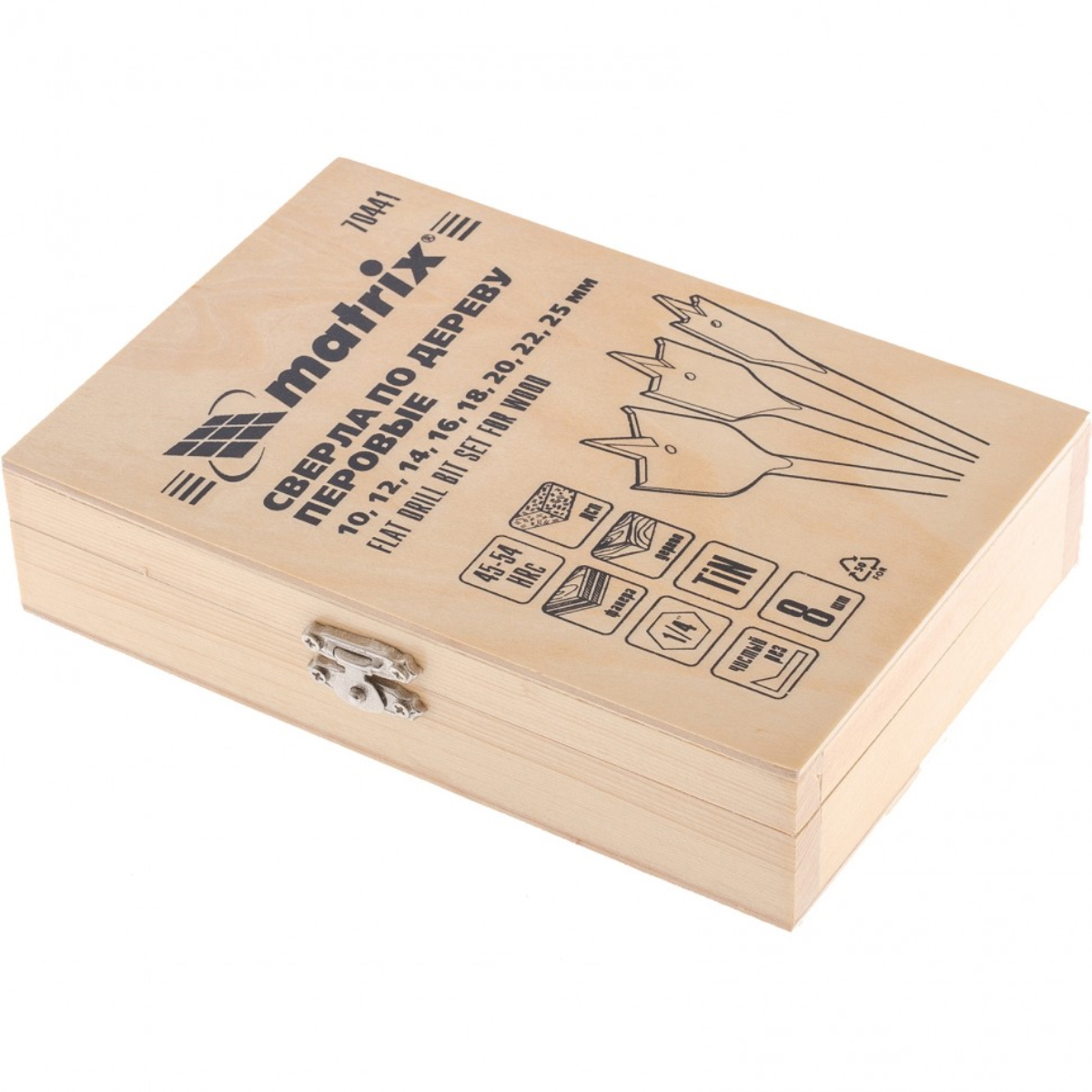 Набор Matrix 70441 состоит из 8 перовых сверл диаметром 10-12-14-16-18-20-22-25 мм и комплектуется деревянным кейсом. Предназначен для осуществления работ по дереву. С его помощью можно получить сквозные и глухие отверстия. Сверла рассчитаны на использование с электрическими и механическими дрелями или шуруповертами.Предназначены для сверления отверстий в древесине. Перовые сверла изготовлены из углеродистой стали. Твердость режущих кромок 45–54 HRc. Хвостовики имеют шестигранную форму, что предотвращает поворот сверла. Особенности набора: Наличие подрезных кромок, которые позволяют получать отверстия с улучшенным качеством поверхности. Сверла имеют нитрид титановое покрытие, что повышает износостойкость и долговечность инструмента. Удобный деревянный кейс для хранения. Комплектация: Перовые сверла 8 шт: 10-12-14-16-18-20-22-25мм. Деревянный кейс.Преимущества:Износостойкость и высокий ресурс – сверла имеют нитрид-титановое покрытие, а режущие кромки закалены до необходимой твердости.Качественная работа – за счет подрезателей сверло обеспечивает получение отверстий с ровной поверхностью.Центрирующее острие – не нужно выполнять предварительное засверливание.Шестигранный хвостовик – сверла не прокручиваются в патроне.Деревянный кейс – набор удобно хранить и транспортировать.Характеристики:Материал обработки: деревоМарка стали: 45Количество предметов: 8Тип хвостовика: шестигранныйМинимальный диаметр: 10 ммМаксимальный диаметр: 25 мм